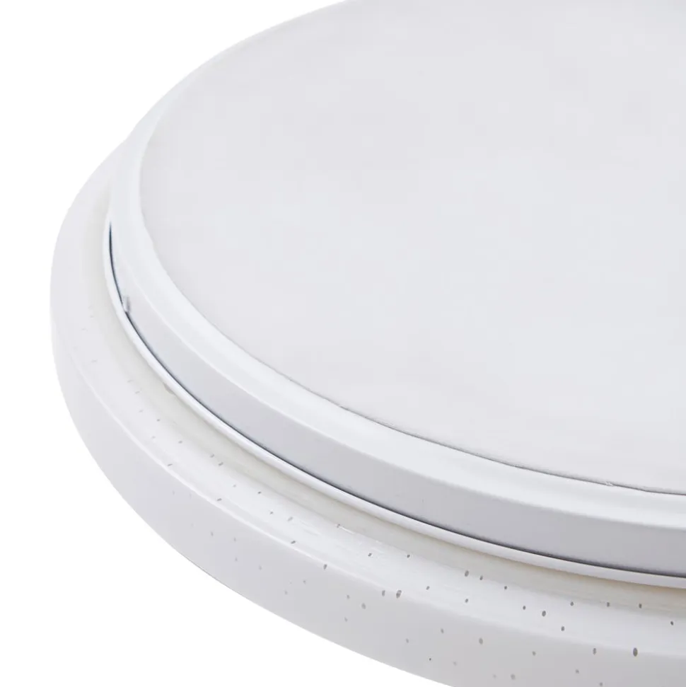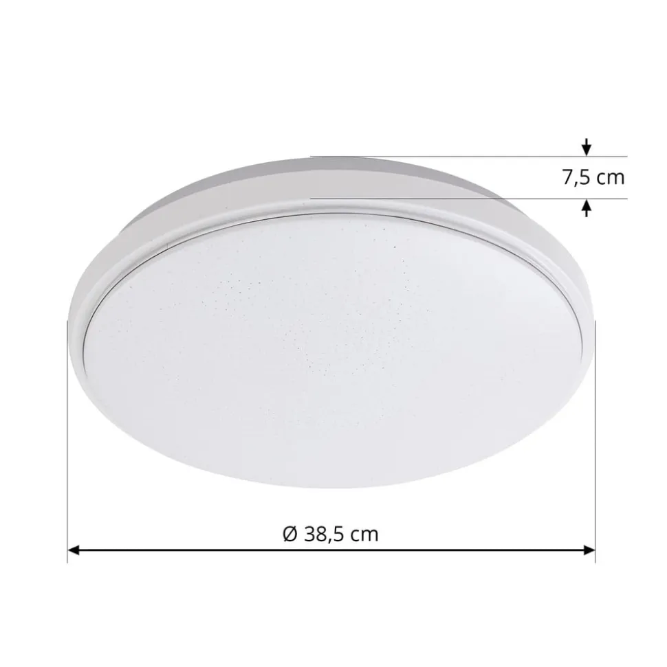 Glamo LED-loftlampe i et funklende design med IP44-beskyttelse Glamo er en funklende LED-loftlampe, som også kan installeres i badeværelser og wellnessområder takket være kapslingsgraden. Armaturet er lavet af metal og plast og har en fantastisk stjerneeffekt både i bunden og på siderne, som funkler smukt, når det er tændt. Det hvide armatur med den smalle, forkromede ring er en glamourøs lyskilde til mange områder og udsender energieffektivt, universalhvidt lys takket være moderne LED-teknologi.