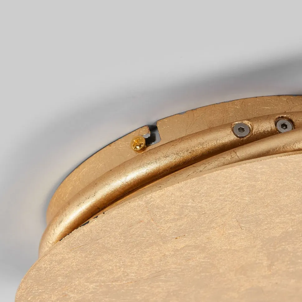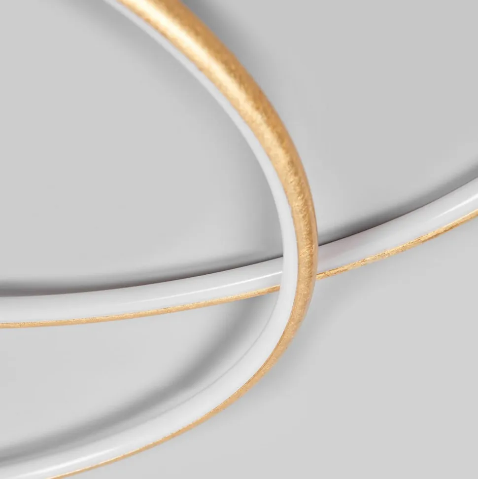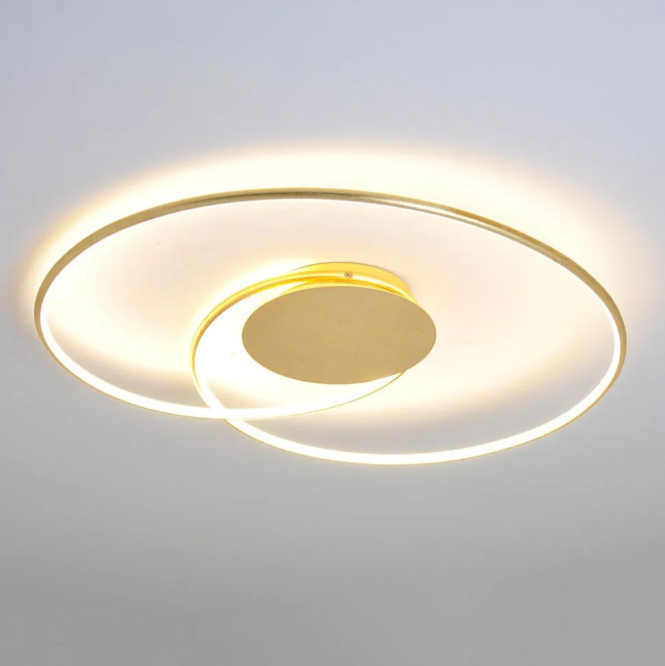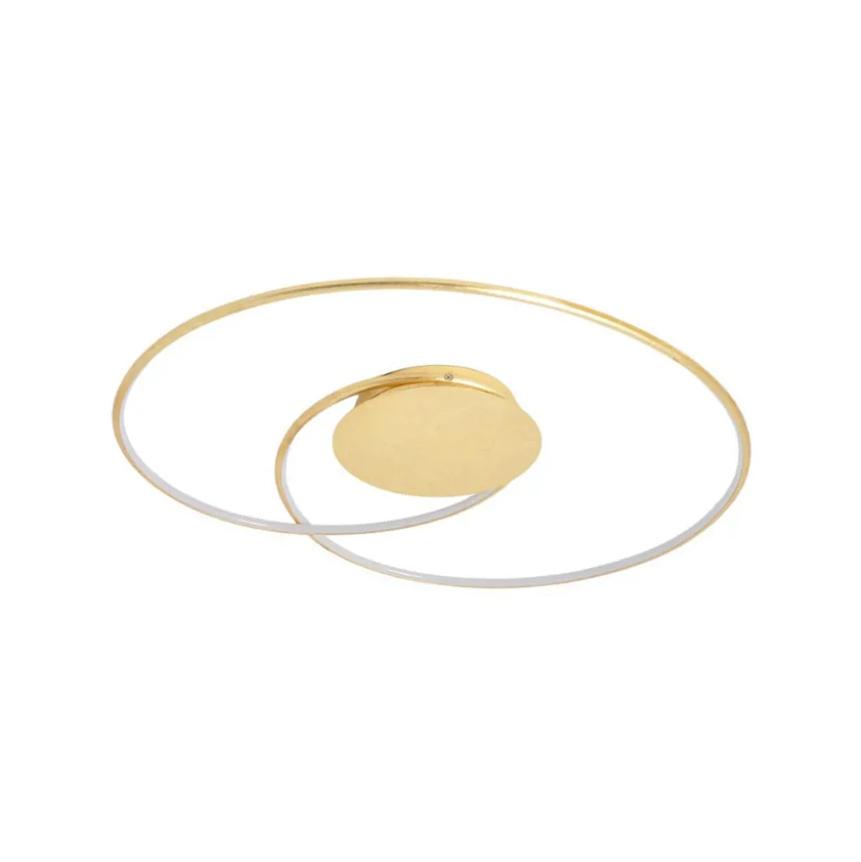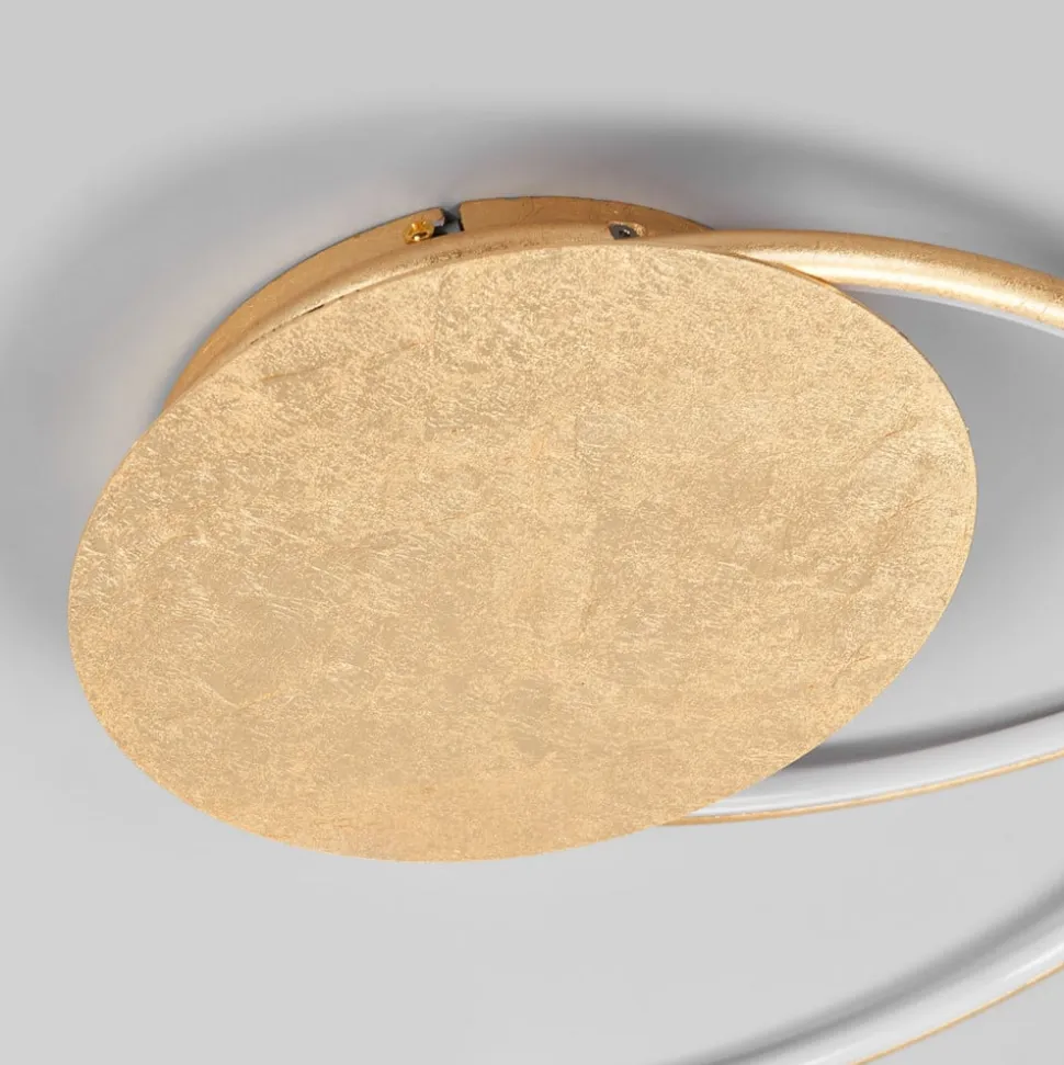 Gylden LED-loftlampe Joline med et filigranagtigt udseende Joline har ikke en konventionel skærm, men et rundt lyselement, der næsten er kringleformet, hvilket giver den et imponerende og attraktivt udseende. Med sine slanke konturer kan LED-loftlampen integreres perfekt i moderne indretningsstile, selv om den gyldne overflade også giver Joline et mere klassisk look.