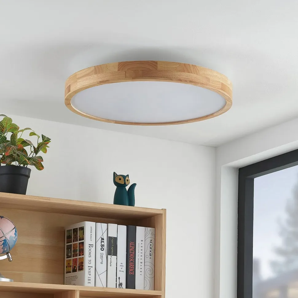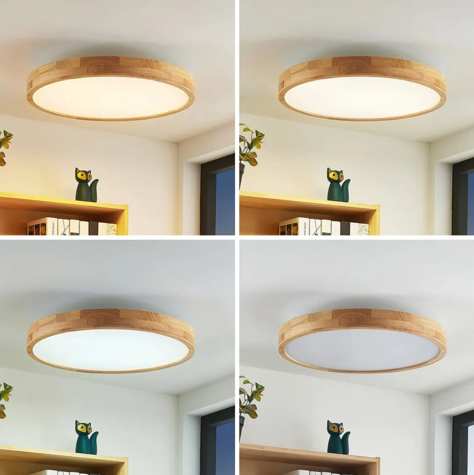 Dæmpbar Lanira LED-loftlampe med justerbar hvid lysfarve Lanira LED-loftlampen har et særligt design. Dens klassiske runde form kan integreres i næsten ethvert miljø uden straks at tiltrække opmærksomhed. Huset af smukt egetræ giver armaturet en varm accent, der kan integreres i forskellige indretningsstile. Armaturet kan dæmpes trinløst, og lysfarven kan ændres i tre trin (3000 K, 4000 K, 6500 K) ved hjælp af den medfølgende fjernbetjening. Lysfarven kan også ændres i disse trin ved hjælp af den normale vægkontakt.