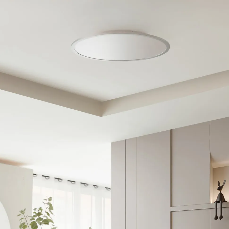 Dæmpbar Narima LED-loftlampe med mange praktiske ekstrafunktioner Narima LED-loftlampen imponerer med sit enkle design og mange funktioner, der kan styres med den medfølgende fjernbetjening. Lampen egner sig ikke kun til koncentreret arbejde, men også til hyggelige aftener. Det skyldes, at lysstyrken kan justeres trinløst fra 10 procent til 100 procent, og at lysfarven også kan ændres i tre trin efter behov (2.700 K/4.000 K/6.500 K), hvilket ikke kun er muligt via fjernbetjeningen, men også via en almindelig vægkontakt. Det betyder, at de hvide toner kan justeres, så de passer til situationen, på ingen tid. Praktisk nok er der også integreret en hukommelsesfunktion, så de valgte indstillinger kan gemmes. Lyset kan også slukkes automatisk efter 15 minutter takket være natlystilstanden. Narima LED-loftlampen viser sig at være en ægte allrounder i hjemmet takket være den justerbare lysstyrke og lysfarve. Men denne smukke lampe kan også finde en passende plads i den kommercielle sektor. Dens diskrete, runde udseende passer ind i forskellige indretningsstile og ser tidløst elegant ud.