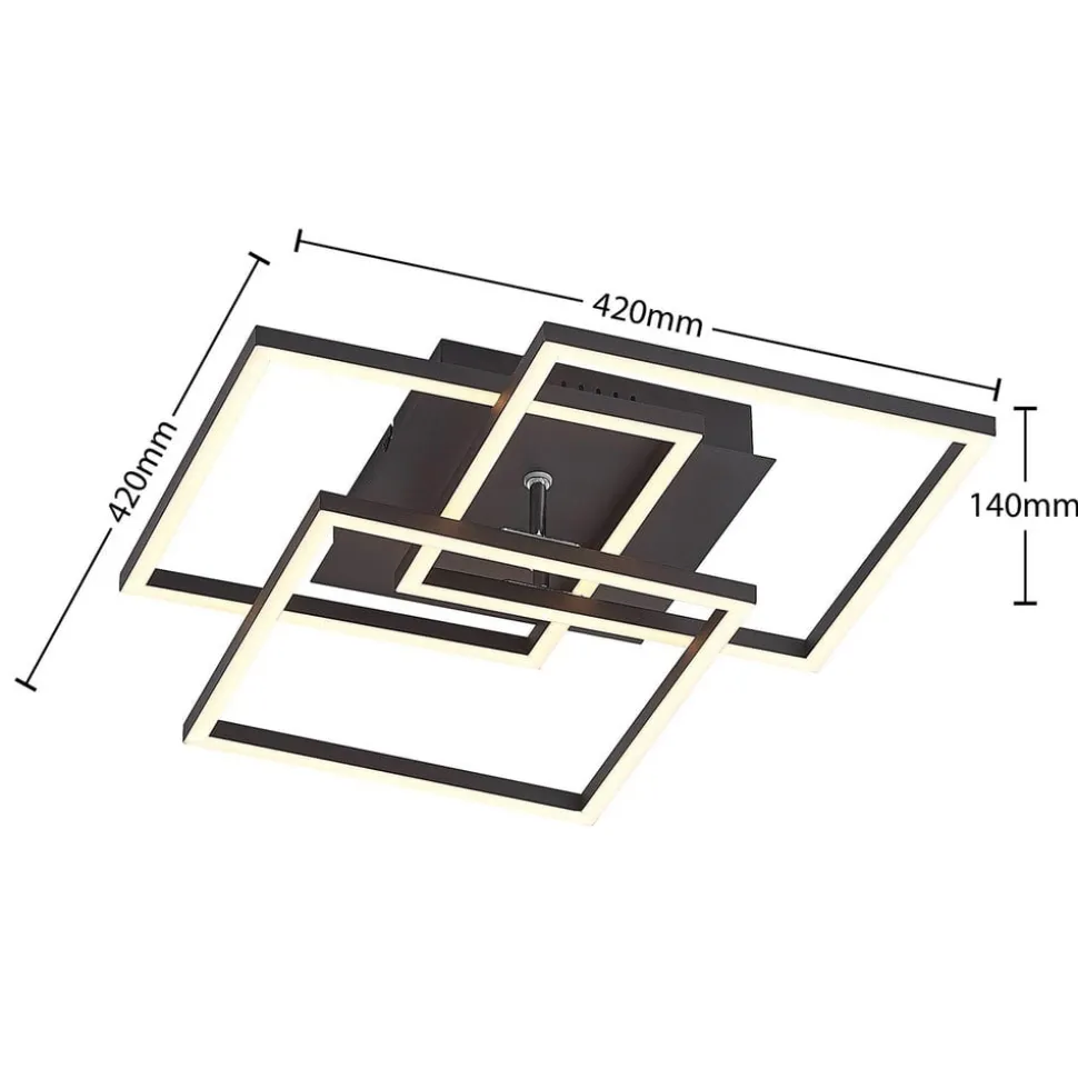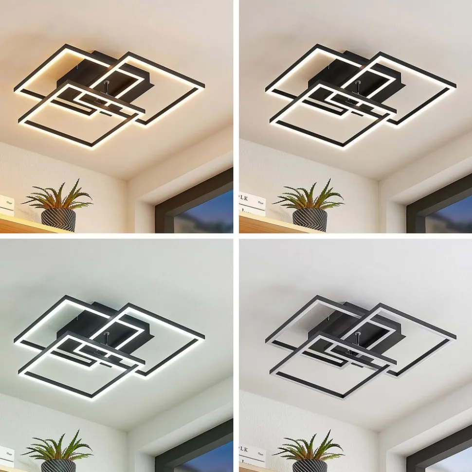 Mørk Qiana LED-loftlampe med regulerbar lysfarve og lysstyrke Qiana LED-loftlampen har et mørkt look. Dens firkantede lampeskærme giver en ensartet belysning hele vejen rundt og ser meget moderne ud i loftet, selv når den er slukket. Lysfarven på de energibesparende LED’er kan ændres i flere trin (2.700 K, 4.000 K, 6.000 K) og skiftes til en natlystilstand ved hjælp af en standard lyskontakt. Lysfarven kan også justeres nemt og trinløst ved hjælp af en fjernbetjening, og lysstyrken kan tilpasses individuelle behov.