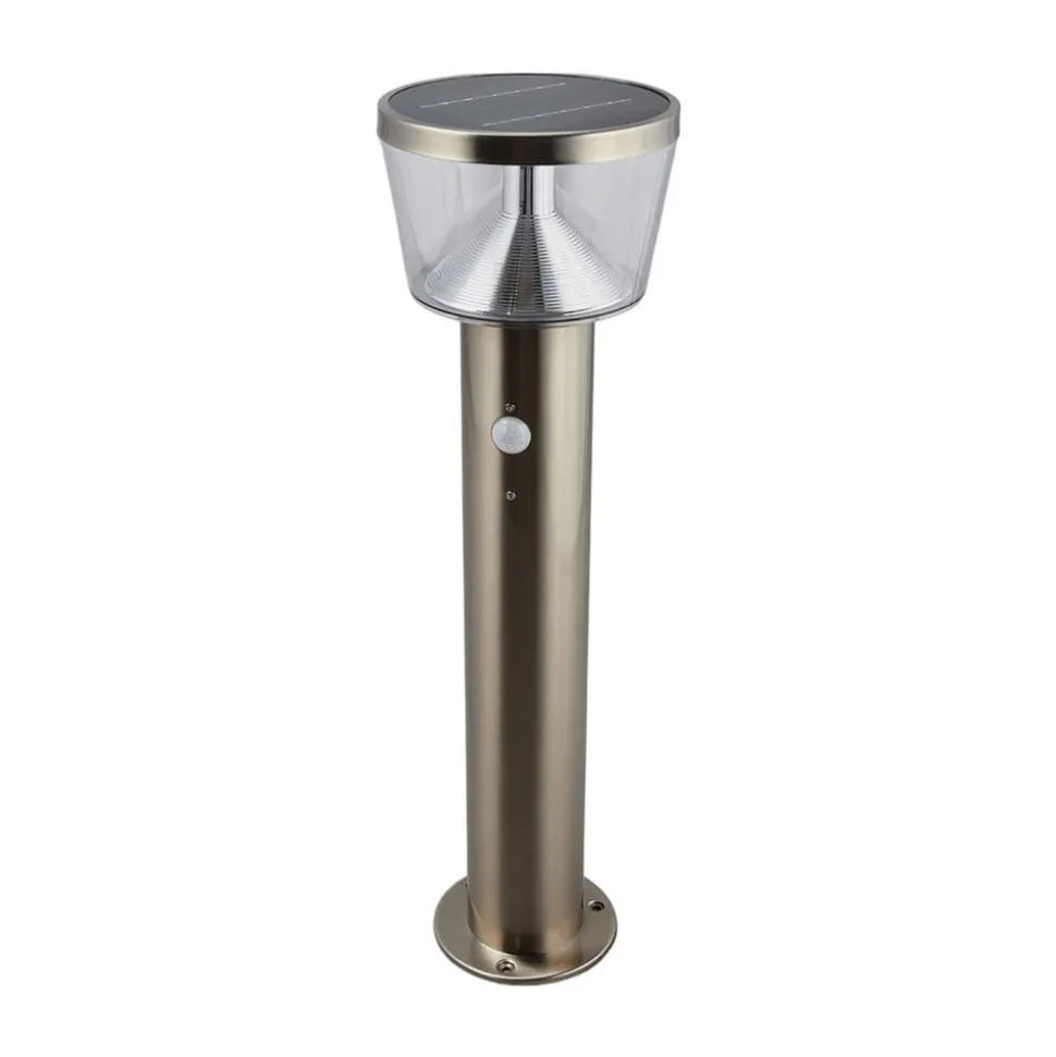 Antje LED-sokkellampe i rustfrit stål med bevægelsessensorfunktion Antje fungerer godt udendørs og har øget funktionalitet takket være bevægelsessensoren og solteknologien. Solpanelet på toppen af lampehovedet fanger solens stråler i løbet af dagen og omdanner deres energi til elektricitet, som så er tilgængelig for LED-belysningen efter mørkets frembrud. Det betyder, at der ikke kræves nogen strømtilslutning til udendørsbelysningen, og at du er relativt uafhængig, når du installerer LED-sokkellampen. Tilstedeværelsesdetektoren sørger for, at lysstyrken øges til fuld styrke, når nogen går forbi lampen og har brug for dens lys. Ellers har den en grundlysstyrke på 75 lumen om natten for at give et behageligt orienteringslys. Lysets varighed ved fuld lysstyrke er ca. 25 sekunder, registreringsvinklen er 90 grader, og rækkevidden er 2 til 6 meter. LED-sokkellampen har et moderne udseende med sit design i rustfrit stål. Lyset fra LED’erne er rettet nedad, hvor det rammer den reflekterende overflade på en reflektorpære og forstærkes i sin effekt.
