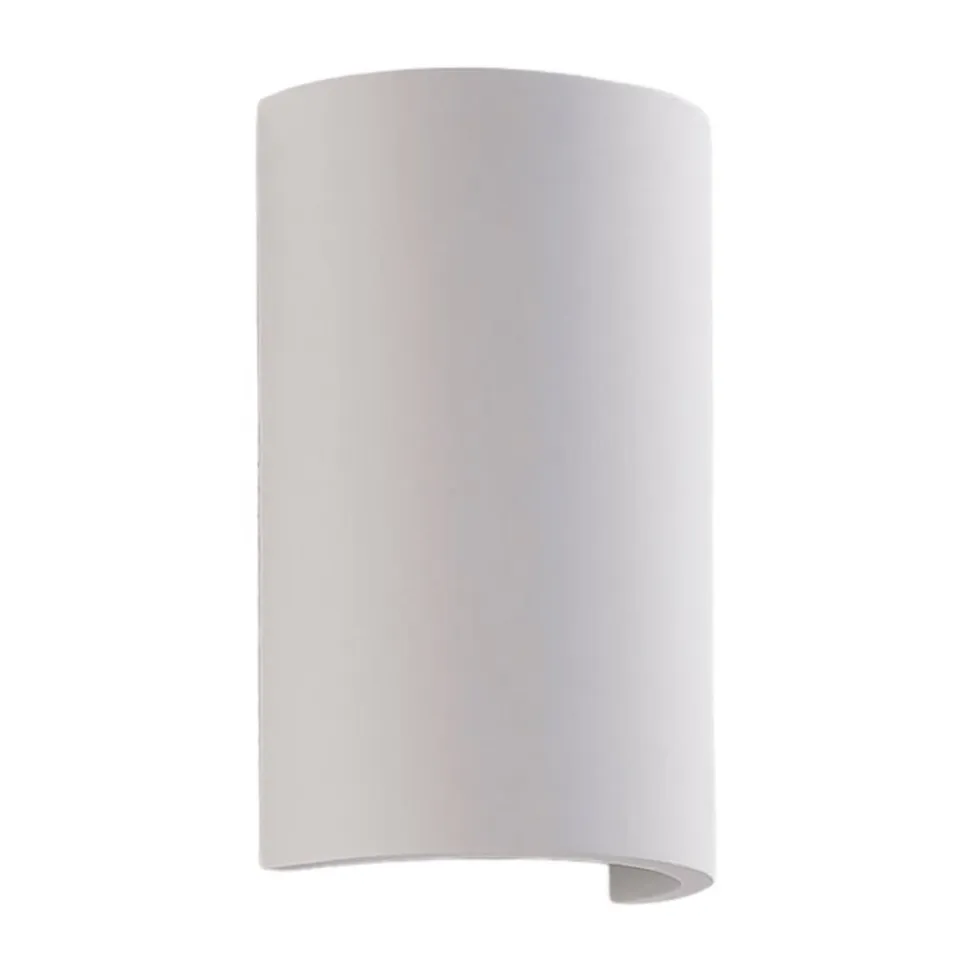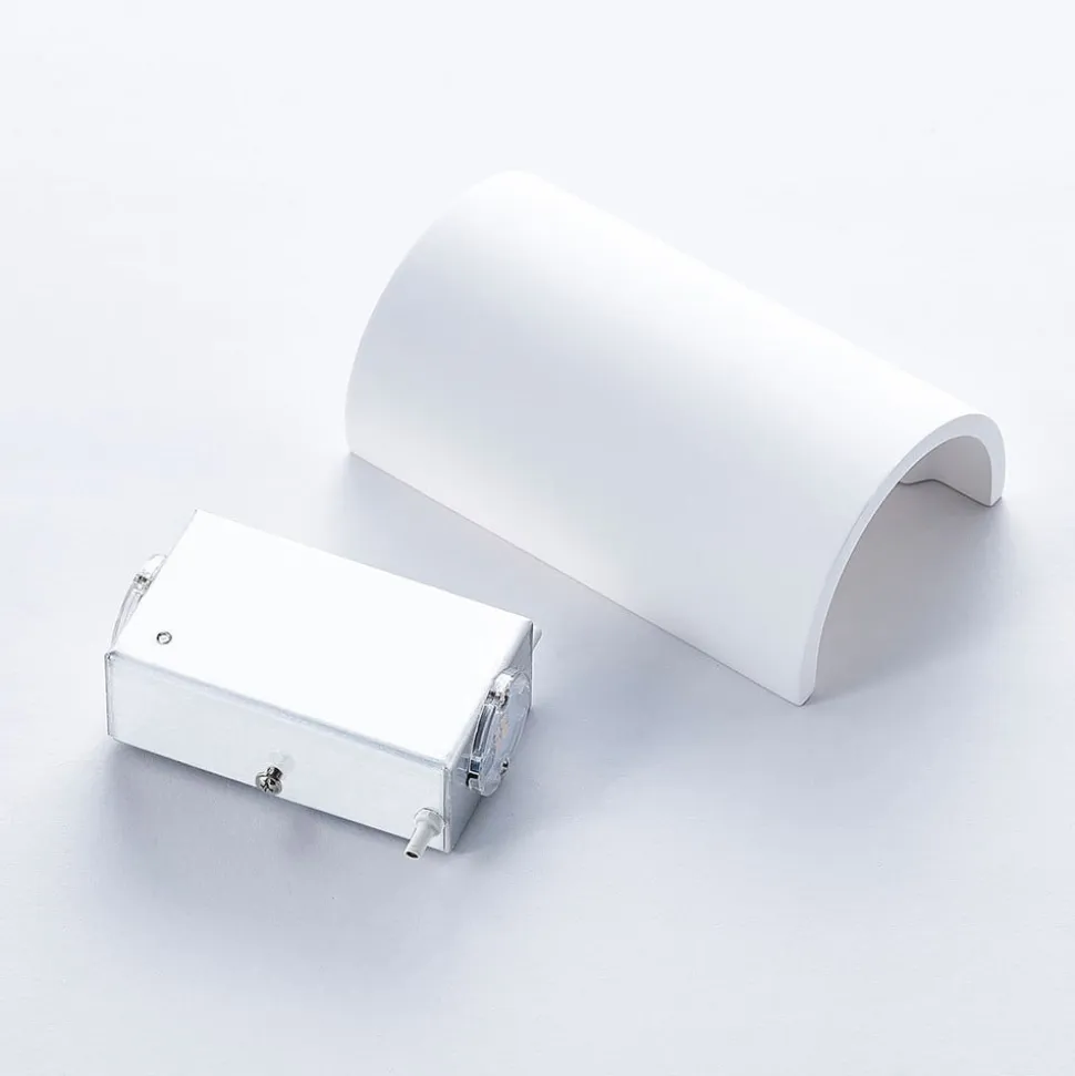 Jenke halvcirkelformet LED-væglampe i gips med dobbelt lysudsendelse og malbar overflade Gipskroppen på denne væglampe er helt hvid, hvilket skaber en særlig harmonisk effekt. Da mange vægoverflader er hvide, er armaturet ideelt til tone-i-tone-arrangementer. Det gælder i øvrigt også, hvis væggen allerede er malet i en bestemt farve, da gipsoverfladen kan males på samme måde som de fleste vægoverflader og kan males i den ønskede farve på ingen tid. LED’erne, som er skjult bag den halvcirkelformede afdækning, kan lyse opad og nedad på en blød, flydende måde takket være Jenkes design og er blandt de mest energibesparende lyskilder i moderne design.