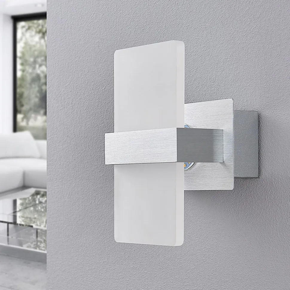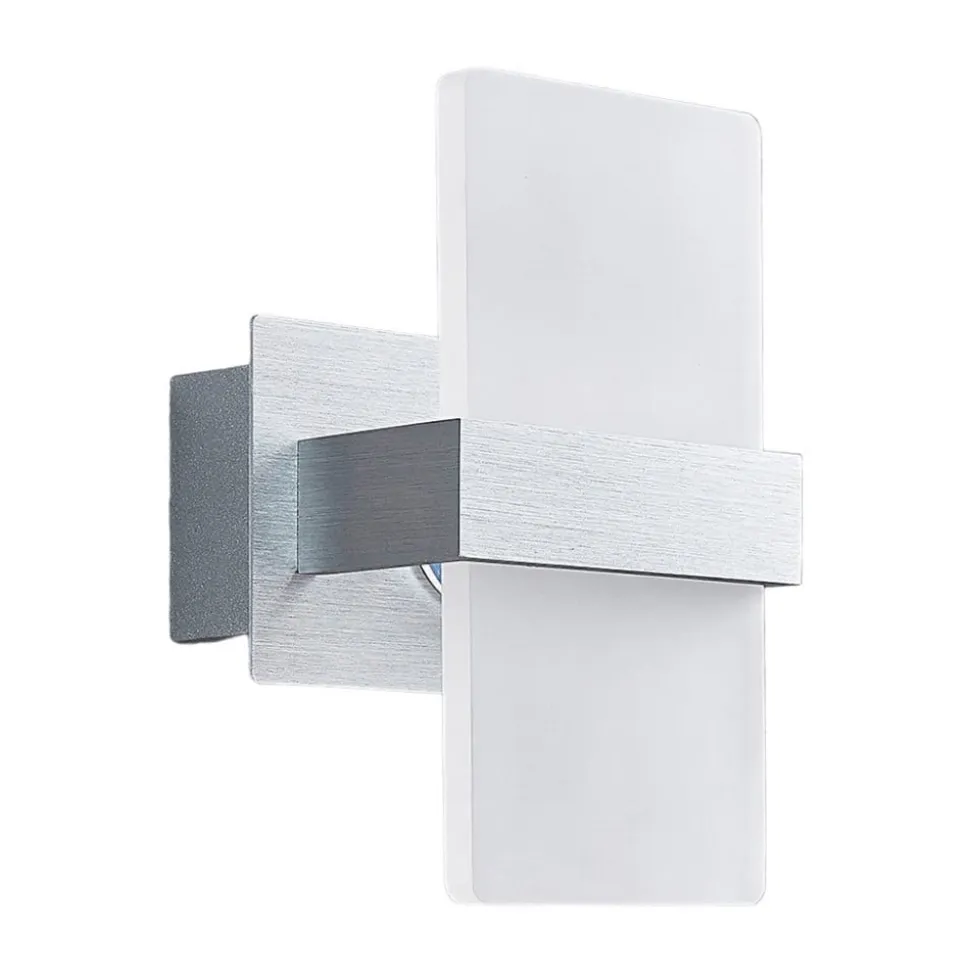 Elegant LED-væglampe Yorick med satineret plastblænde og børstet metalbøjle i aluminium
