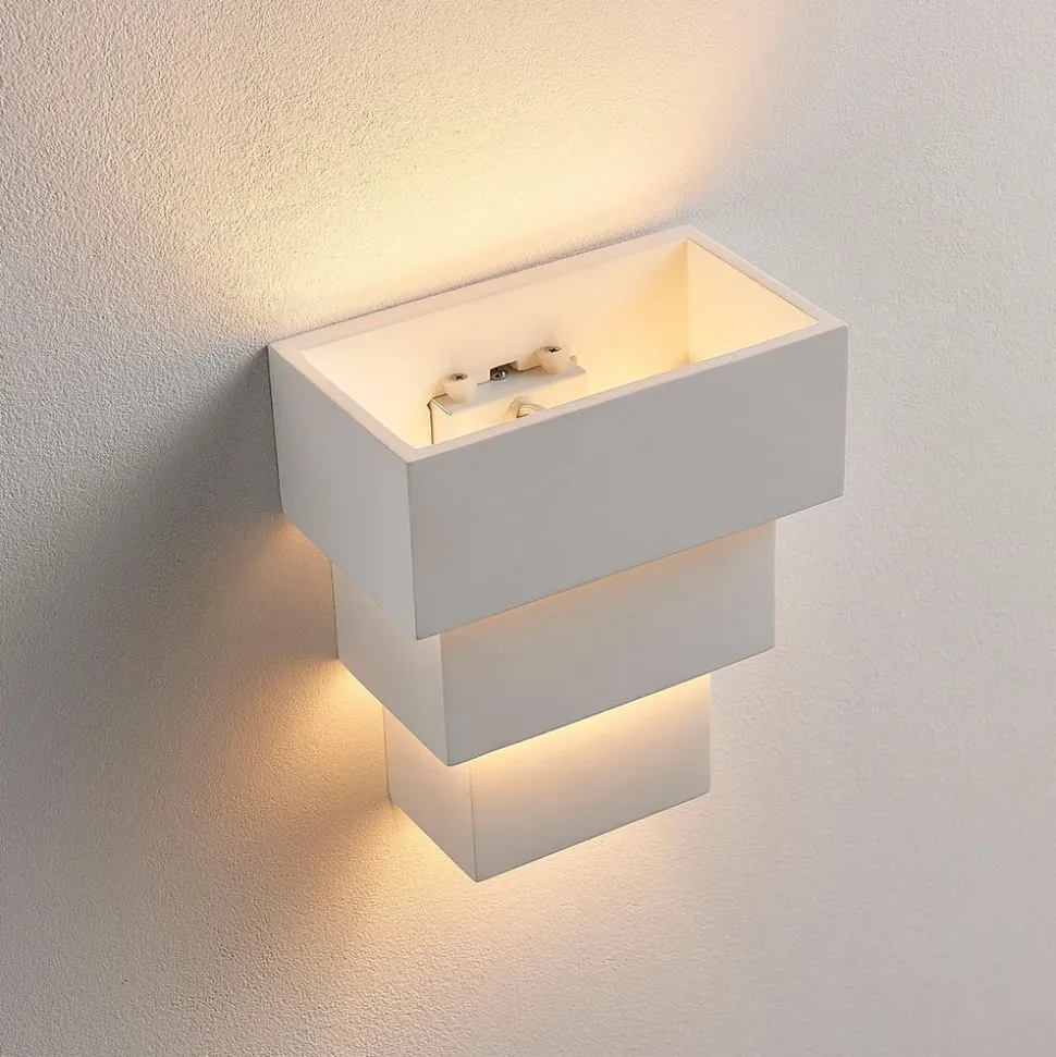 Tre-trins væglampe Antonella med hvid gipsoverflade Den kantede, tre-trins form på denne gips væglampe lader lyset slippe ud gennem hullerne på en særlig effektiv måde, hvilket skaber en meget hyggelig belysning i stuen. Ved hjælp af en passende LED-pære (medfølger ikke) forbruges der næsten ingen strøm, når Antonella er i brug, og den hvide gipsoverflade ikke bare spotlighter en harmonisk atmosfære, men kan også males.