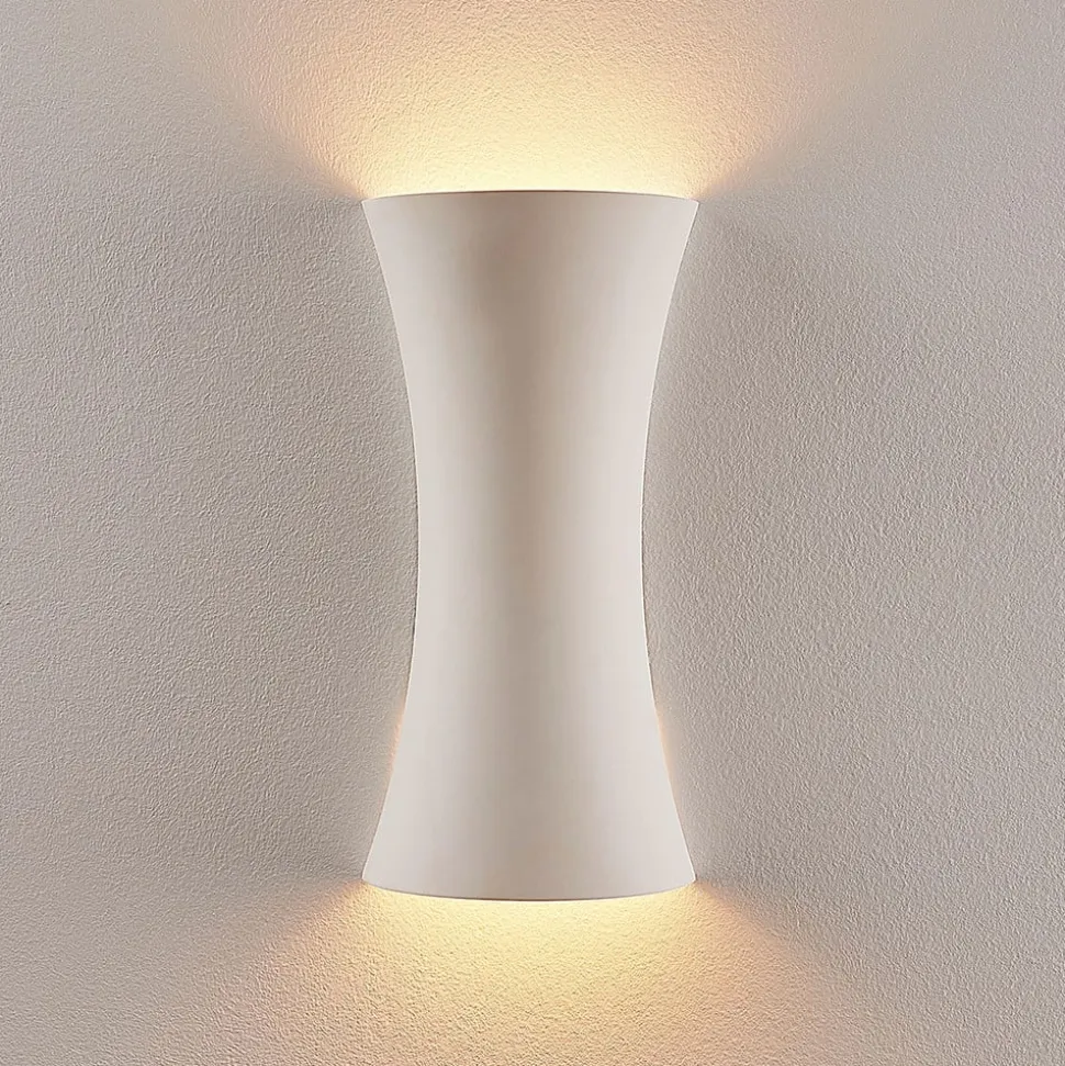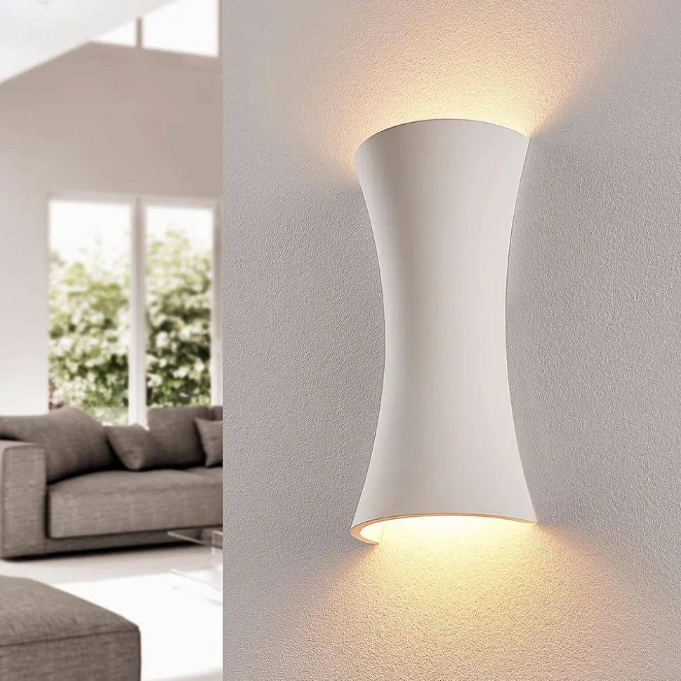 Konkav støbt gips væglampe Edon, åben i top og bund for et hyggeligt lysudslip Denne væglampe giver et lys, der er fri for blænding. Den konkave støbte gipskrop er designet på en sådan måde, at lyset kun skinner opad og nedad uden at rette øjet mod lyskilderne. Det giver en hyggelig lyseffekt, som ikke kun er velkommen i entréer og korridorer, men også i stuer og soveværelser. Gipsgrundmaterialet er ikke kun kendetegnet ved sit hvide, meget harmoniske udseende, men også ved, at man kan tage en pensel og male for at tilpasse overfladedesignet efter behov, da gips er et materiale, der kan males. Forbrugerne kan selv bestemme, om de vil male armaturet i en eller flere farver eller endda tilføje et kunstnerisk motiv.