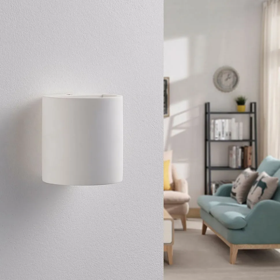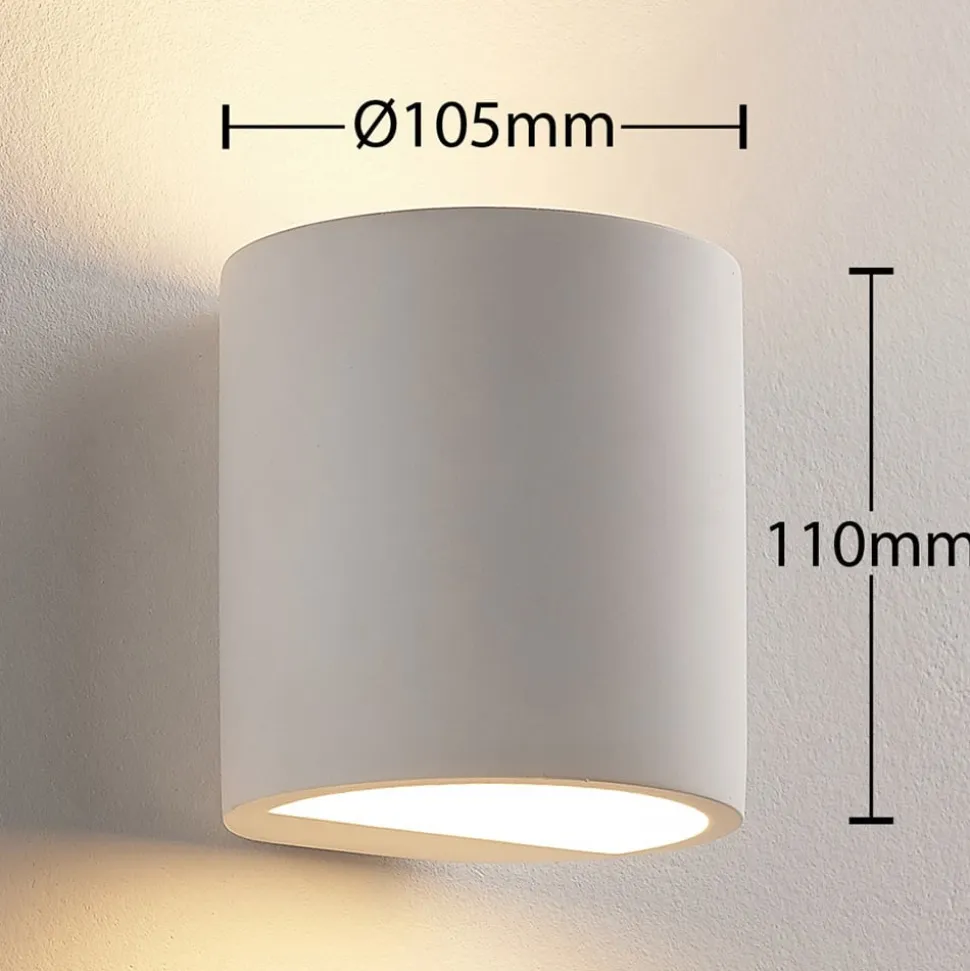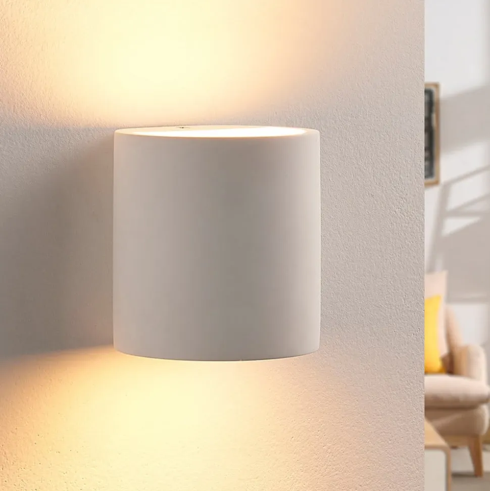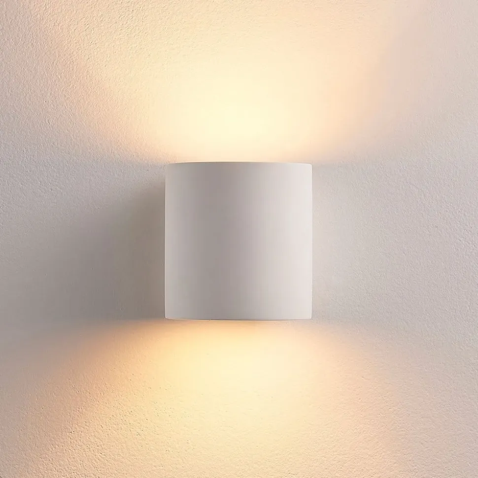 Krista – hvid gipsvægslampe, kan males Krista gipsvægslampen har en cylindrisk form og spotlighter opad og nedad, fordi lampeskærmen er åben der. Det skaber en hyggelig lyseffekt, som er ideel til accentbelysning, og den er lavet af hvid gips, hvilket giver armaturet et særligt harmonisk udseende. Men hvis du foretrækker det, kan du også male eller farve overfladen, hvilket er let at gøre med gips.