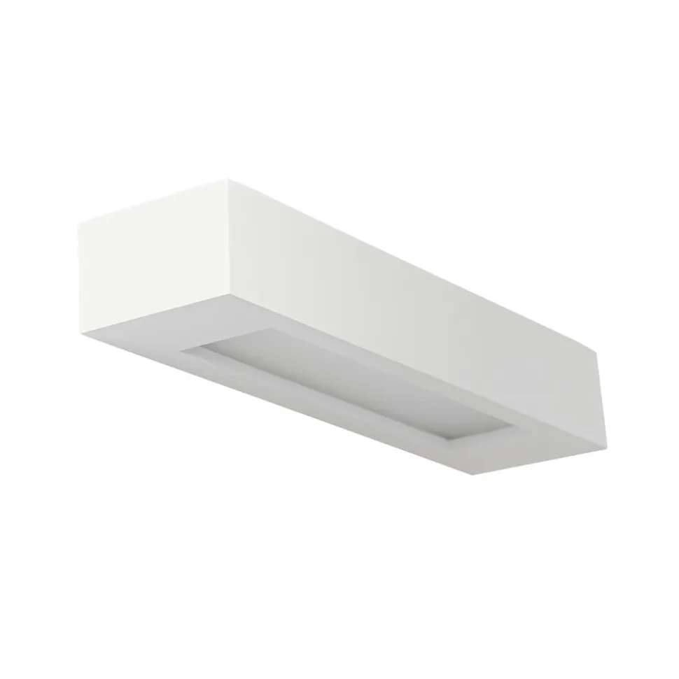 Matteo kantet væglampe med hvid gipsoverflade, kan males Matteo ligner en hvid mursten, og først ved andet øjekast er man klar over, at den skjuler en dekorativ væglampe, der giver indirekte lys. I bunden er der en diffusor af satineret glas, som sikrer en mere jævn fordeling af lyset, mens forsiden er lavet af uigennemsigtig gips. Væglampen kan monteres med lyskilder med E14-sokkel og er ideel til brug i korridorer eller trappeopgange, dvs. områder i hjemmet, der er præget af hyppig passage, men hvor målrettet belysning ikke er det vigtigste kriterium. Takket være armaturet med 2 pærer opnås en behagelig grundlysstyrke, selv når kun væglampen er tændt. Den vigtigste egenskab ved gips som overflade er, at det er muligt at ændre farven bagefter eller at male den med individuelle motiver eller illustrationer – for alle dem, der ikke vil gå glip af et individuelt præg, selv med belysning! Til dette formål følger der sandpapir og handsker med lampen for at sikre en optimal overfladebehandling før priming.