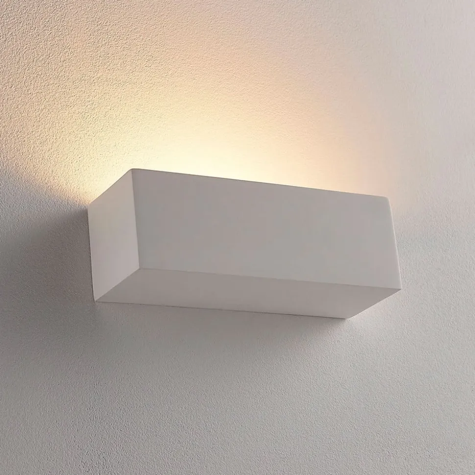 Kantet, hvid gipsvægslampe Santino med et slankt look Santino har et helt tidløst look med sin kantede form og spotlighter et smukt opadgående lys, der virker meget hyggeligt. Gipsvægslampen er derfor ideel til stemningsfuld accentbelysning og vil lyse mange aftener op med en hyggelig effekt. Endelig skal det nævnes, at gipsoverflader er velegnede til at blive malet. Det åbner op for helt nye muligheder for at individualisere armaturet efter egne ideer.