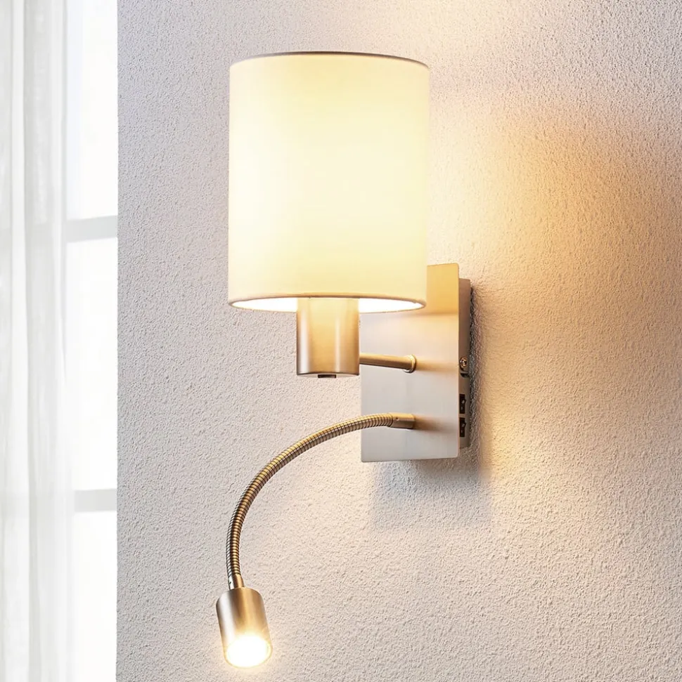 Hvid stofvæglampe Shajan med integreret, fleksibel LED-læselampe Shajan-væglampens udseende domineres af den cylindriske lampeskærm af hvidt stof. Bag den sidder en E27-fatning, som kan udstyres med en lyskilde efter eget valg. Ud over denne lyskilde, som giver et smukt, særligt stemningsfuldt feel-good-lys, er der en fleksibel arm på rammen, som fører til den integrerede LED-læselampe. Takket være flexteknologien kan det lille spotlight justeres uden huller, så lyset skinner præcis, hvor der er brug for det. For ekstra bekvemmelighed er de to kontakter placeret direkte på stellet, og denne funktion gør Shajan ideel som belysningsmulighed til sofaen eller sengen.