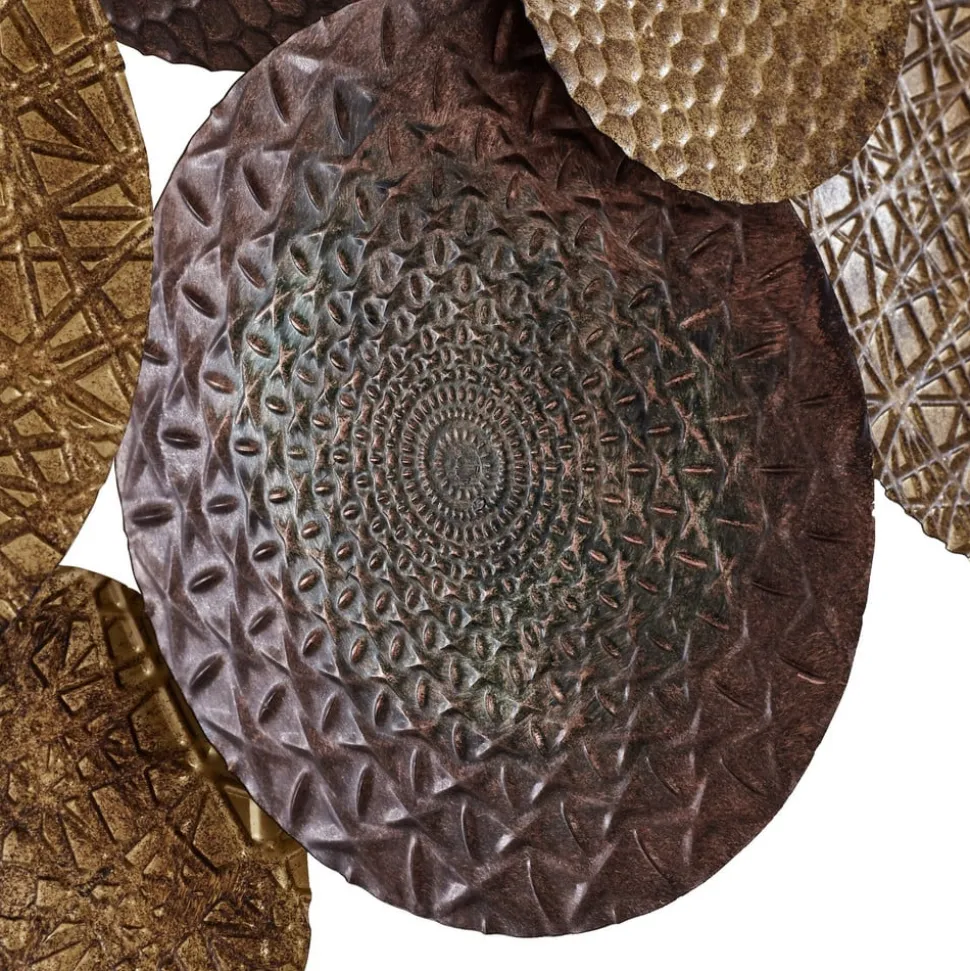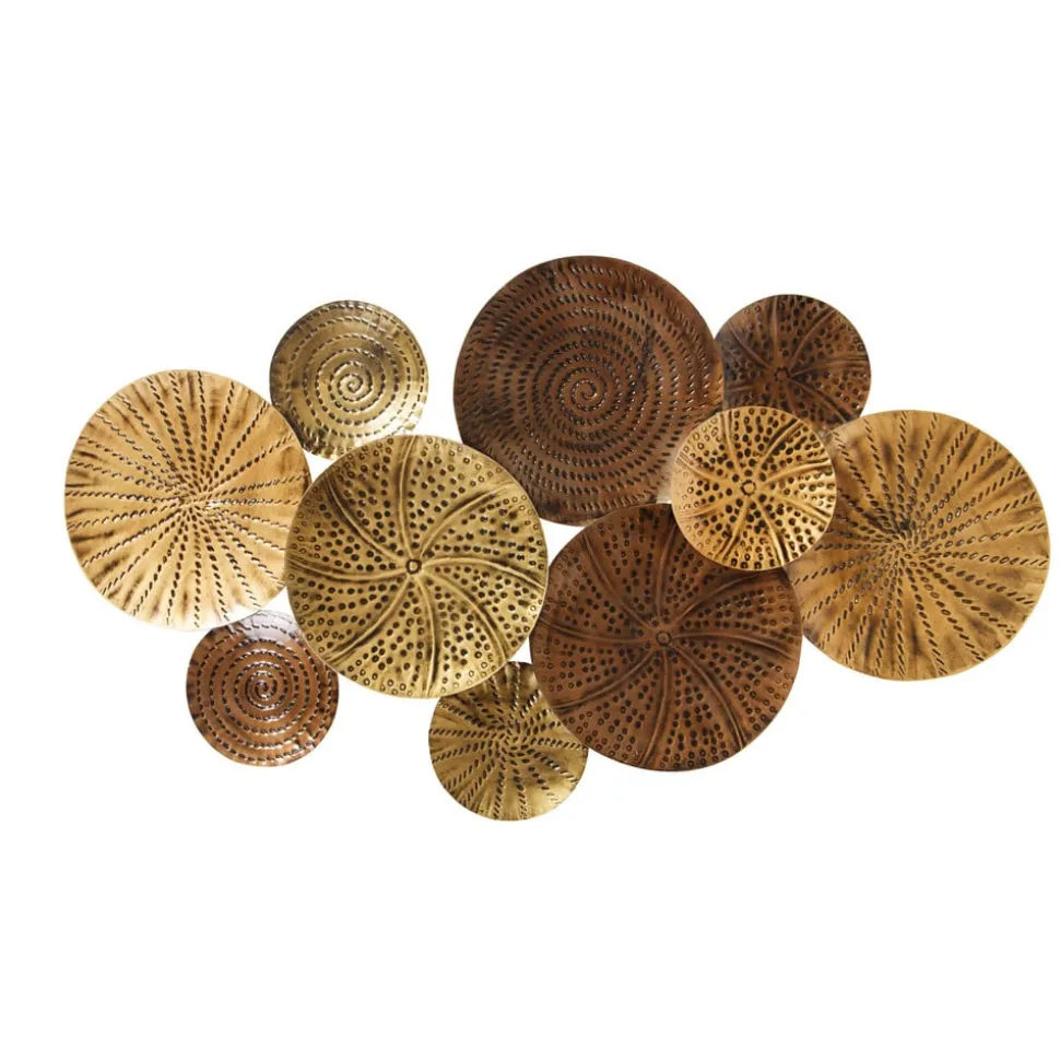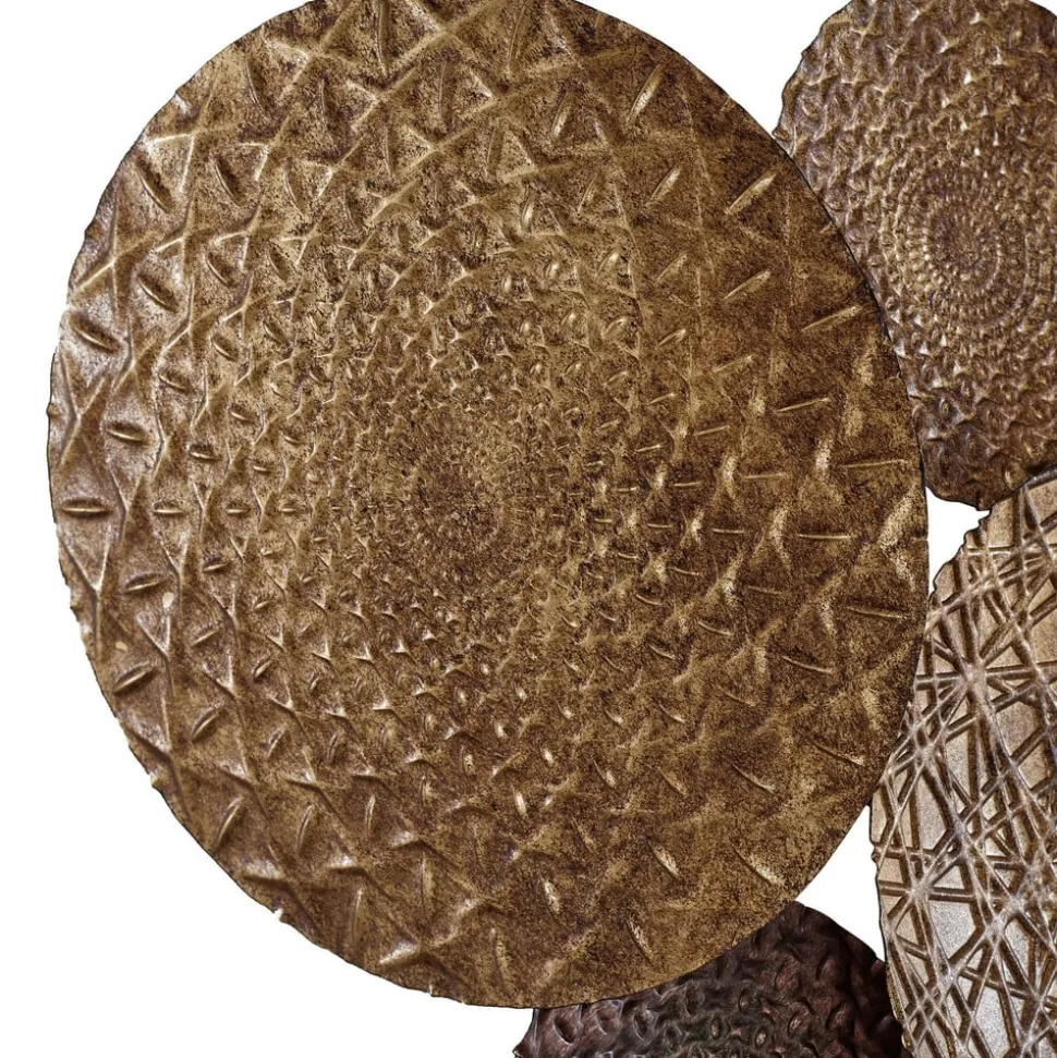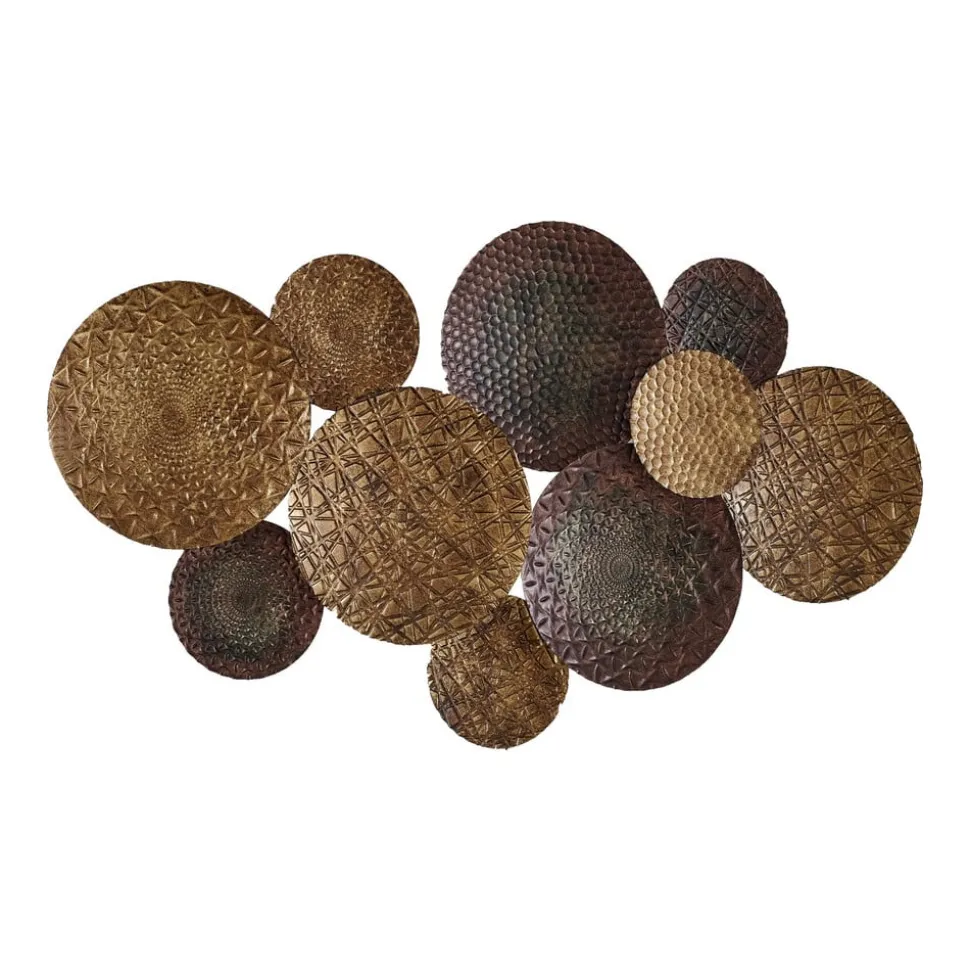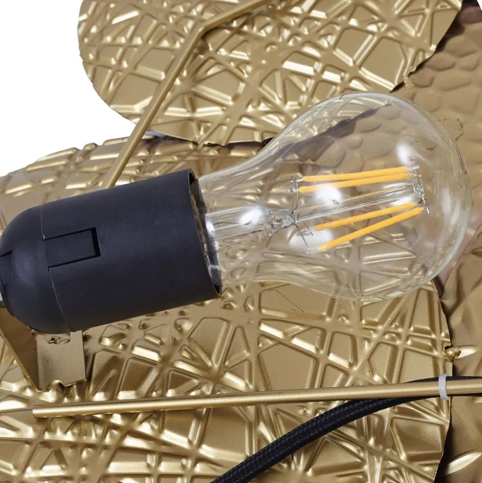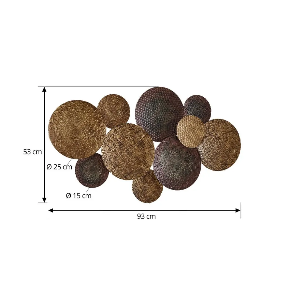 Orientalsk inspireret Soraya væglampe med runde skærme Denne væglampe er designet i en orientalsk stil og lavet af robust jern. De guld- og kobberfarvede elementer giver den et strejf af elegance. De er runde i formen, varierer i størrelse og er dekoreret med forskellige mønstre, hvilket gør dem til et unikt blikfang i ethvert rum. Soraya-væglampen er ikke kun et dekorativt element, men også en lyskilde, der skaber en behagelig atmosfære. Dette opnås ved hjælp af de to skjulte pærer, der sidder bag de runde elementer og skaber indirekte lys hele vejen rundt.