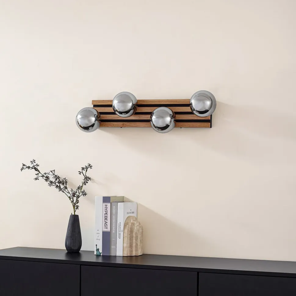 Væglampe Woodora forener den naturlige skønhed af gummitræ med elegancen af røggråt glas. Denne lampe med 4 lyskilder er et highlight i ethvert designorienteret interiør og skaber en fascinerende lyseffekt. Optisk minder den om moderne akustikpaneler. Den kan monteres både på loftet og på væggen.