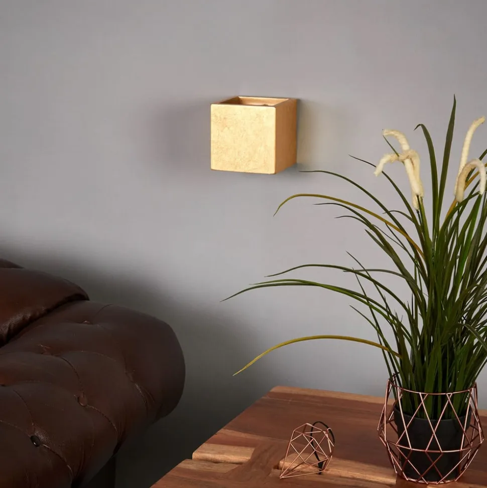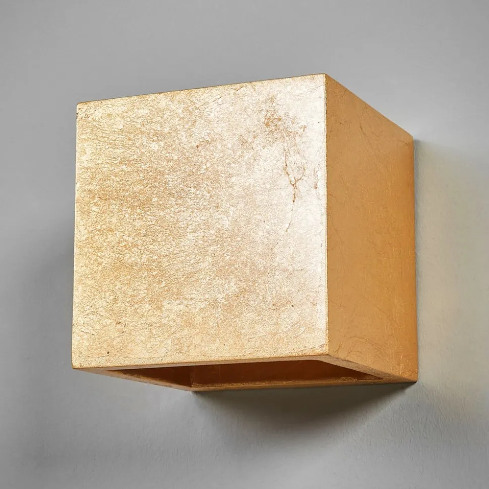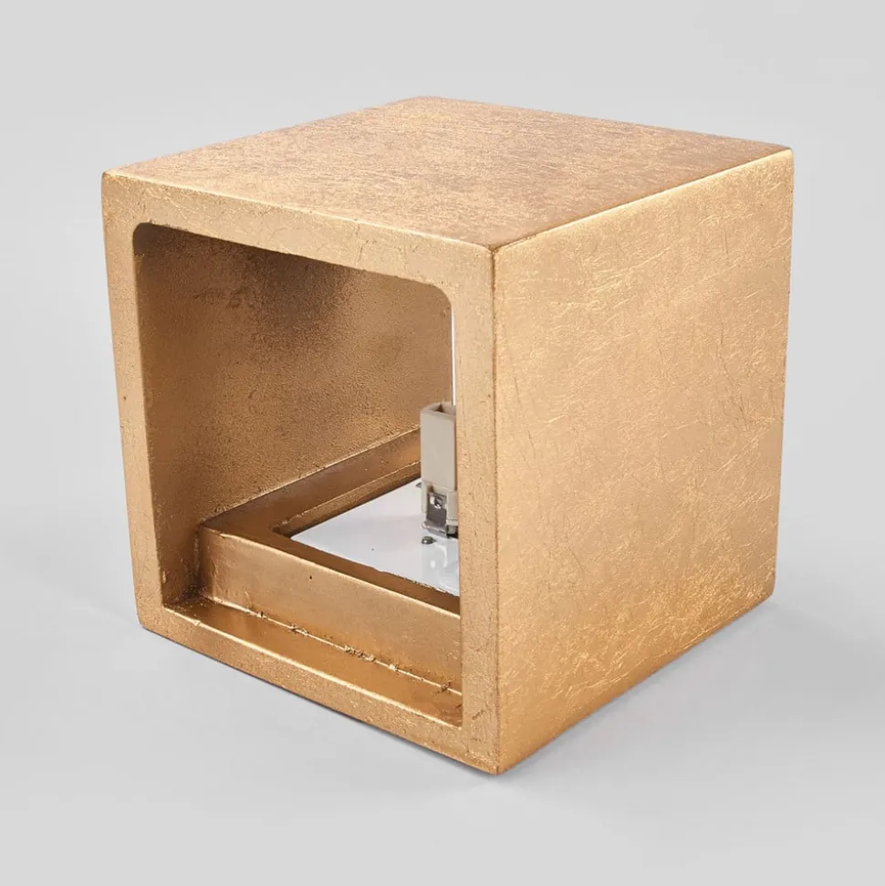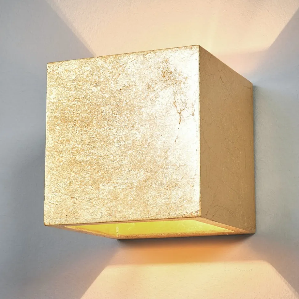 En lysende kube med en varm guldfinish: Yade-væglampen er designet til brug med pærer og skaber en meget hyggelig lyseffekt, da lyset skinner opad og nedad. Det betyder, at den oplyste kube kan bruges i et soveværelse, men også kan installeres i en gang eller stue. Du vil ikke savne den hyggelige effekt nogen steder. Et ægte HighLight er gipsoverfladens guldfinish, som skaber et særligt varmt udtryk. Den er ikke ensartet, men har ujævne nuancer og nuancer, der skaber et meget stilfuldt indtryk.
