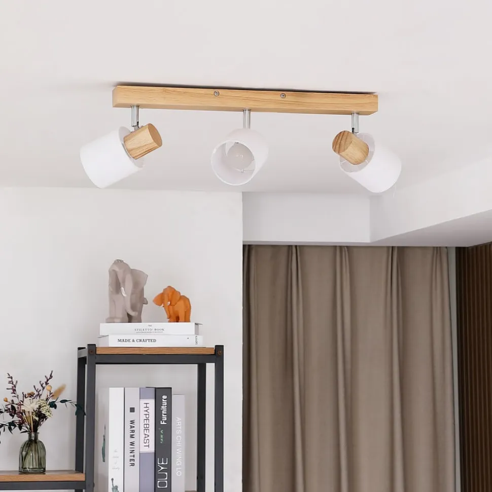 Wanessa loftspot i træ med tre bevægelige skærme Wanessa loftspot, som er lavet af træ og udstyret med tre hvide stofskærme, udstråler en behagelig varme, selv når den er slukket. Det naturlige materiale ser meget tiltalende ud her og er dygtigt kombineret med små, bevægelige lampeskærme. Loftspottet har tre af disse, som kan drejes i forskellige retninger afhængigt af rummet og situationen. Dette muliggøres af de små led, som er udført i skinnende krom og udgør en yderligere visuel komponent i designet. Wanessa loftlampen kan bruges på mange forskellige måder i forskellige boligområder, hvad enten det er i stuen, gangen eller soveværelset.