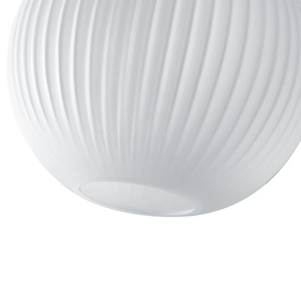 Smuk Loft pendellampe med glasskærmDen kugleformede glasskærm på Loft pendellampen giver ideel belysning i moderne opholdsrum, f.eks. over borde. Lampeskærmen er udstyret med riller og holdt i opalhvid, og den giver en vidunderlig kontrast til resten af armaturet. Baldakinen samt tekstilkablet er holdt i sort og giver dermed det moderne look.