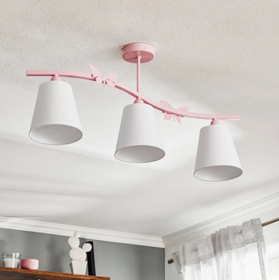 Loftlampen Alice kombinerer moderne design med materialer af høj kvalitet og er et blikfang i ethvert rum. Med sine tre elegante hvide stofskærme og den stilfulde lyserøde accent passer den perfekt ind i den unge boligstil. Kombinationen af tekstil og stål skaber en harmonisk balance mellem lethed og stabilitet, der gør indtryk i stuer, soveværelser, børneværelser og spisestuer.