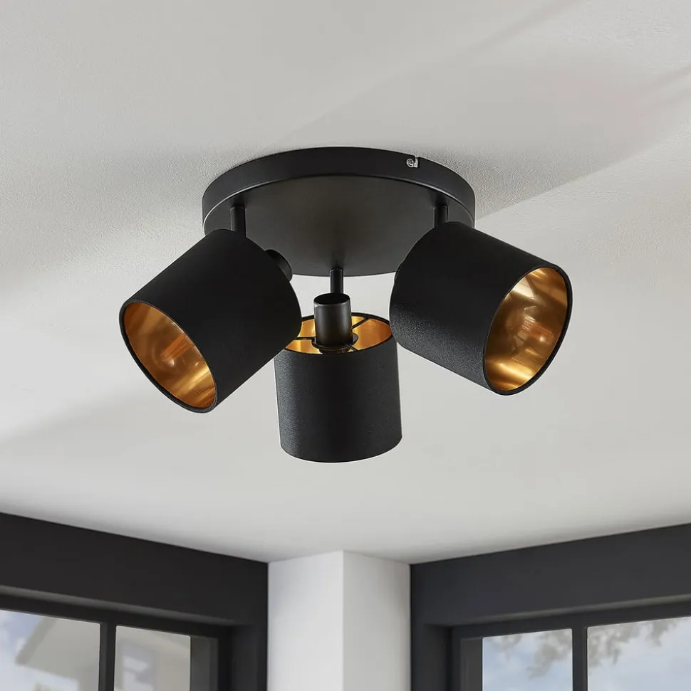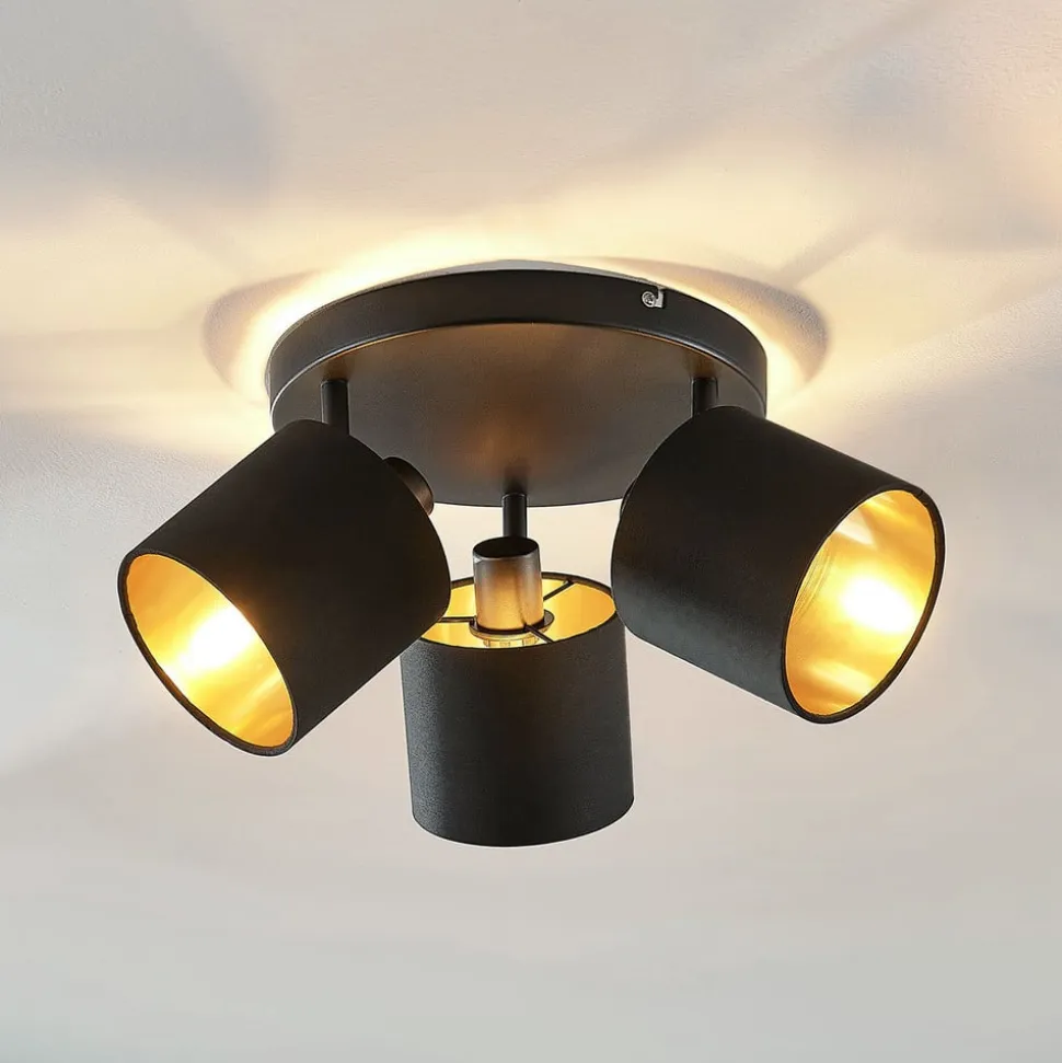 Loftlampe Vasilia i sort og guld Med de tre individuelt justerbare lys i den smukt designede Vasilia loftlampe kan selv større rum blive stemningsfuldt oplyst. Uanset om det er i køkkenet, stuen, soveværelset eller kontoret, forbliver intet hjørne mørkt med denne lampe. Loftlampens ydre kommer i en dyb sort farve, der falder diskret ind i hjemmets interiør. Samtidig er HighLight det gyldne indre, som giver en sofistikeret glød og spotlight afrunder det lineære design med stofbetræk.