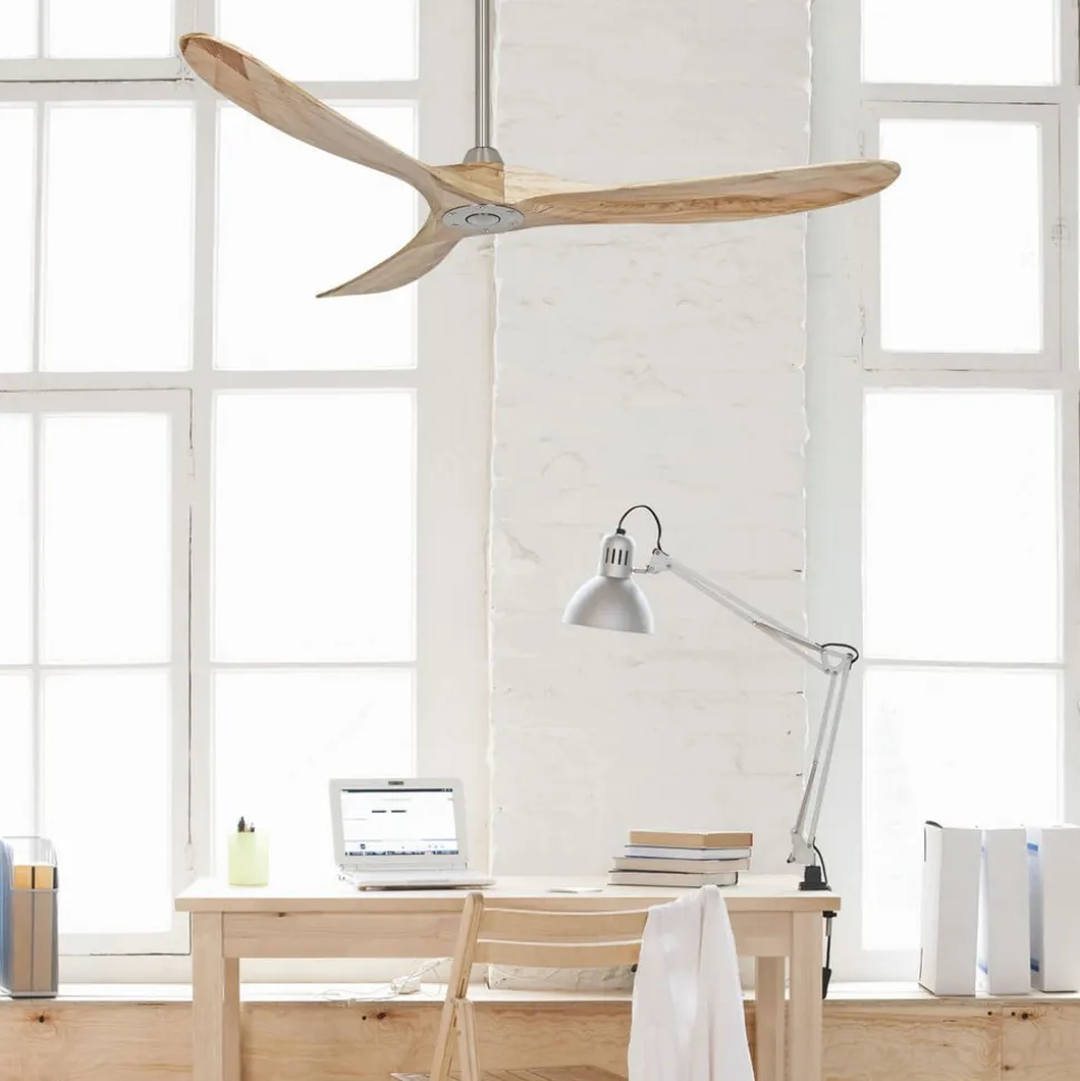 Eco Genuino loftsventilator i træ til store stuer Med en diameter på 152 cm giver Eco Genuino loftsventilatoren en behagelig afkøling, selv i store stuer. De tre vinger af ægte træ, som er lamineret og fræset, giver den et naturligt præg. Funktioner Takket være den medfølgende fjernbetjening med vægbeslag er betjeningen moderne og praktisk. Ud over valget mellem seks hastighedsniveauer kan rotationsretningen også ændres, så opvarmningsomkostningerne kan reduceres om vinteren ved at omfordele den varme luft, der er fanget under loftet. Med sin patenterede DC-motor er ventilatoren også særdeles økonomisk. Tekniske data – Kan også installeres på skråninger op til 16° – Motor med energibesparende, patenteret DC-teknologi – Maksimal luftcirkulation: 12.720 m³/t – Vægt: 7 kg Effekt pr. hastighed: – 3,2 W ved 49 o/min – 3,6 W ved 58 o/min – 4,9 W ved 78 o/min – 6,8 W ved 94 o/min – 10,4 W ved 121 o/min – 16,1 W ved 149 o/min