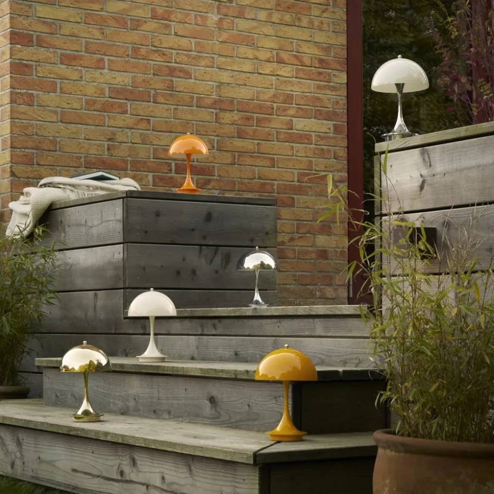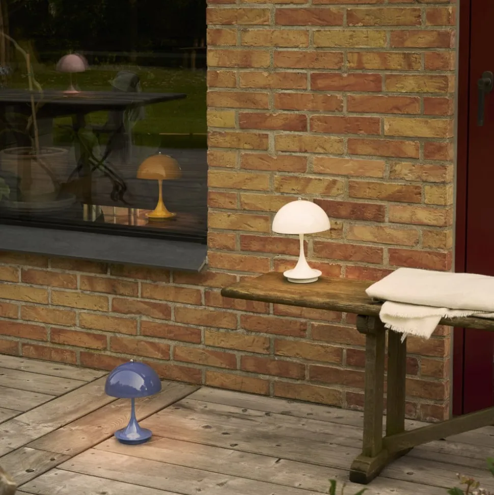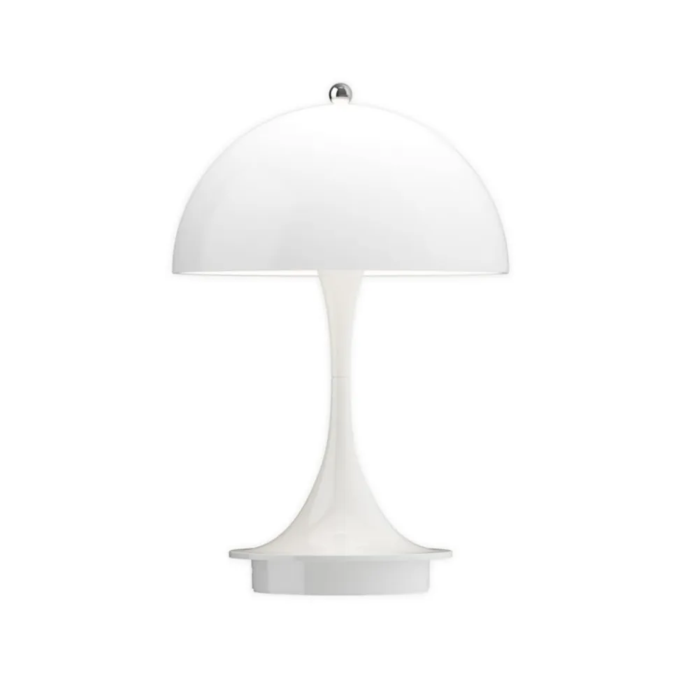 Den batteridrevne LED-bordlampe Panthella Portable 160 i 3. version er fremstillet af sprøjtestøbt, genanvendt polymer. Den er udstyret med en touch-kontakt på den øverste møtrik, hvorved den kan tændes og slukkes og indstilles i tre lysstyrkeniveauer. Designet af Panthella-lampen er et af Verner Pantons mest betydningsfulde designs og afspejler den danske arkitekts store personlighed. Han ønskede at designe en organisk formet lampe, der leverer 100 % blændfrit lys, hvor stativet og skærmen fungerer som lysreflektorer. Panton udviklede Panthella-lampen i 1971 i samarbejde med Louis Poulsen. Lampens karakteristiske form og dens evne til at reflektere et blødt lys fra sin trompetformede fod har givet den status som en designikon. Panthella 160 Portable-lampen er en mindre version af det oprindelige design. Den er perfekt til at tage med fra rum til rum eller ud på altanen eller i haven. Den ser fantastisk ud overalt og skaber en vidunderlig atmosfære.