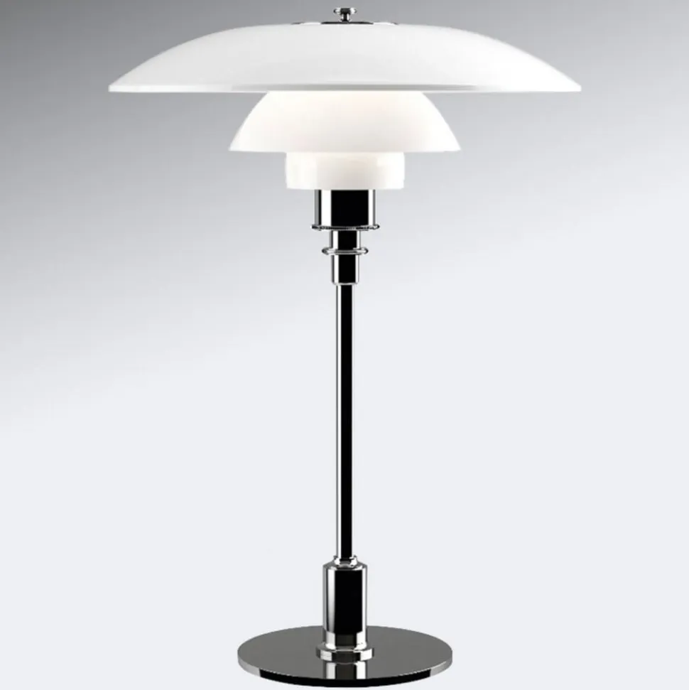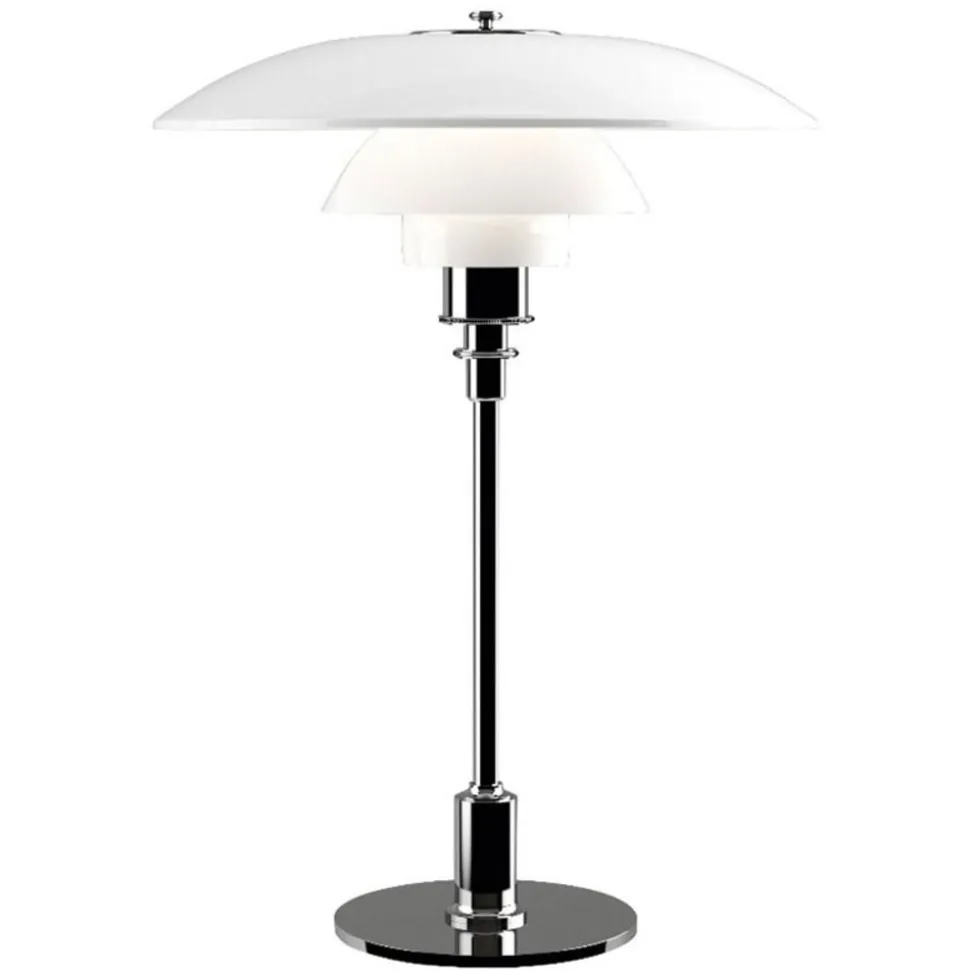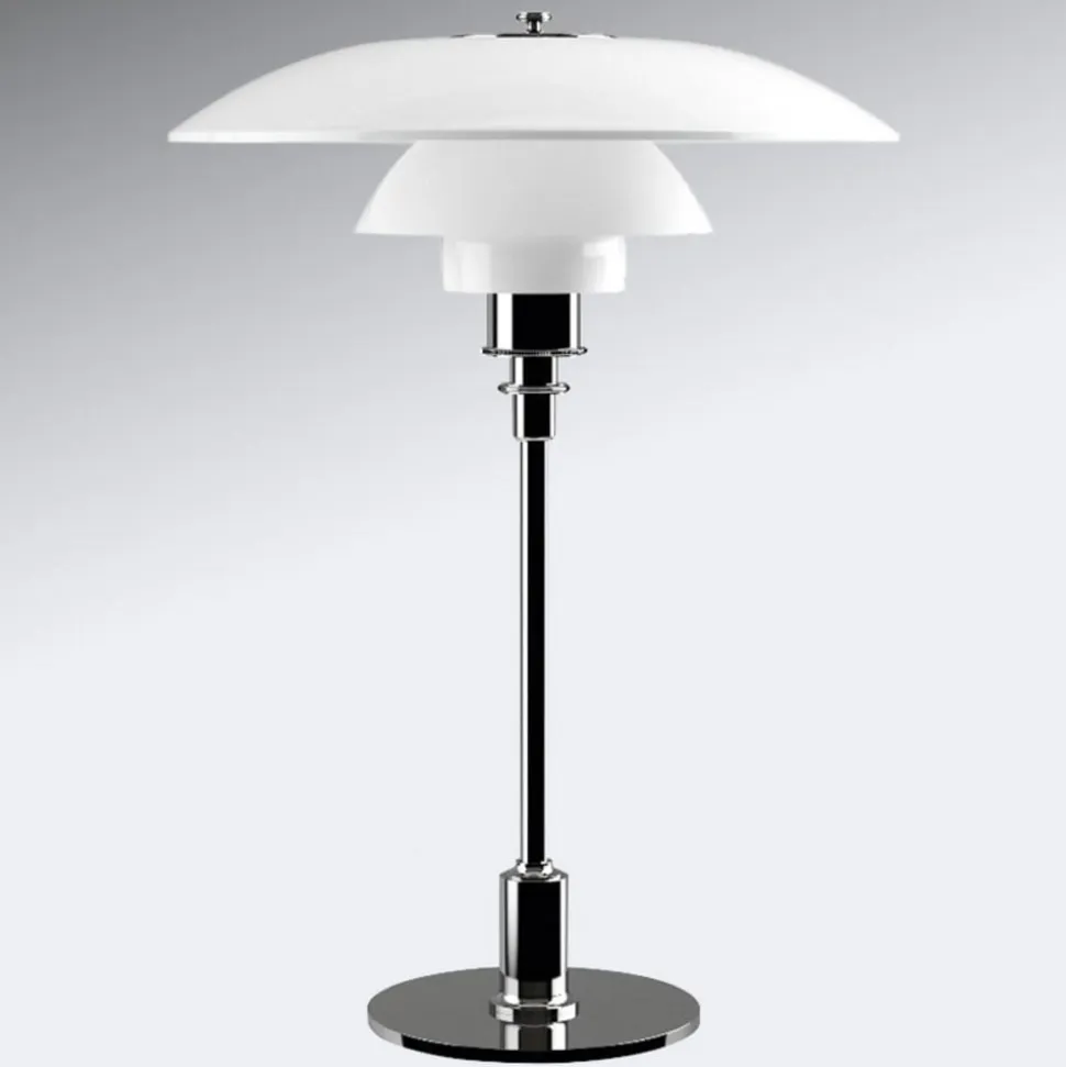 Eksklusivt designet PH 3 1/2 – 2 1/2 bordlampe Stellet på PH 3 1/2 – 2 1/2 bordlampen, som er lavet af messing og har en fin metalfinish, holder en fascinerende skærm lavet af mundblæst trelags opalglas, designet i henhold til et reflekterende treskærmsystem. Skærmen retter det meste af lyset nedad. Glassets særlige karakter – den ene side er blank, den anden mat sandblæst – skaber en meget blød lyseffekt. PH 3 1/2 – 2 1/2 bordlampen passer ind i mange rum, den er ideel som accentbelysning i stuen eller som lyskilde til natbordet og er udstyret med en mellemledsafbryder.
