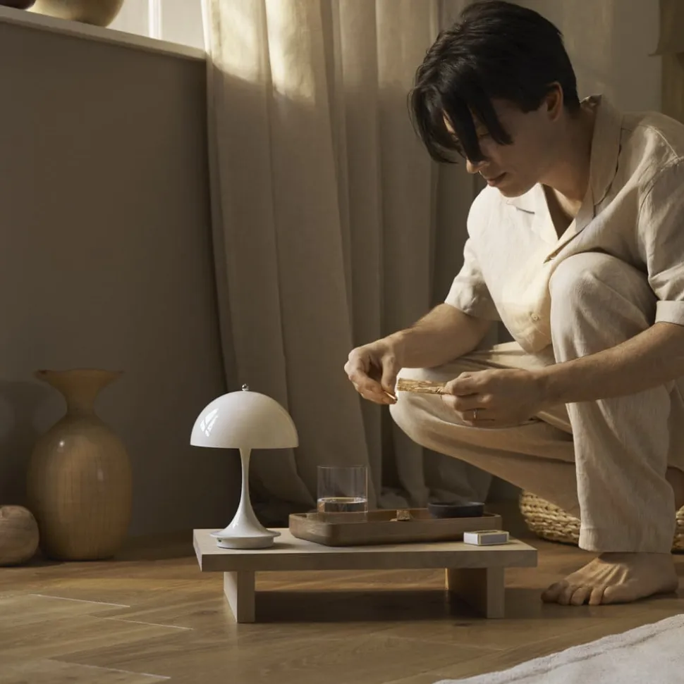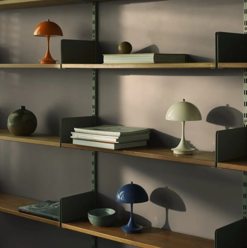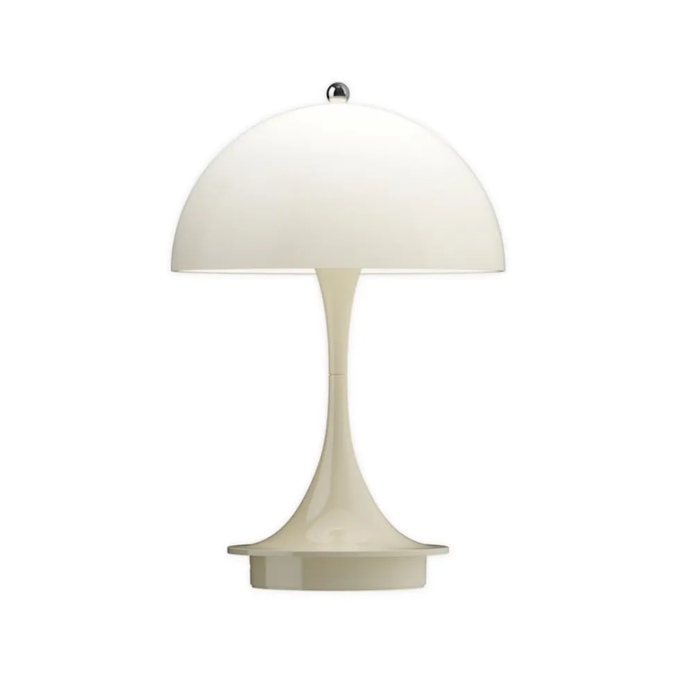 Den batteridrevne LED-bordlampe Panthella Portable 160 i 3. version er fremstillet af sprøjtestøbt, genanvendt polymer. Den er udstyret med en touch-kontakt på den øverste møtrik, hvorved den kan tændes og slukkes og indstilles i tre lysstyrkeniveauer. Designet af Panthella-lampen er et af Verner Pantons mest betydningsfulde designs og afspejler den danske arkitekts store personlighed. Han ønskede at designe en organisk formet lampe, der leverer 100 % blændfrit lys, hvor stativet og skærmen fungerer som lysreflektorer. Panton udviklede Panthella-lampen i 1971 i samarbejde med Louis Poulsen. Lampens karakteristiske form og dens evne til at reflektere et blødt lys fra sin trompetformede fod har givet den status som en designikon. Panthella 160 Portable-lampen er en mindre version af det oprindelige design. Den er perfekt til at tage med fra rum til rum eller ud på altanen eller i haven. Den ser fantastisk ud overalt og skaber en vidunderlig atmosfære.