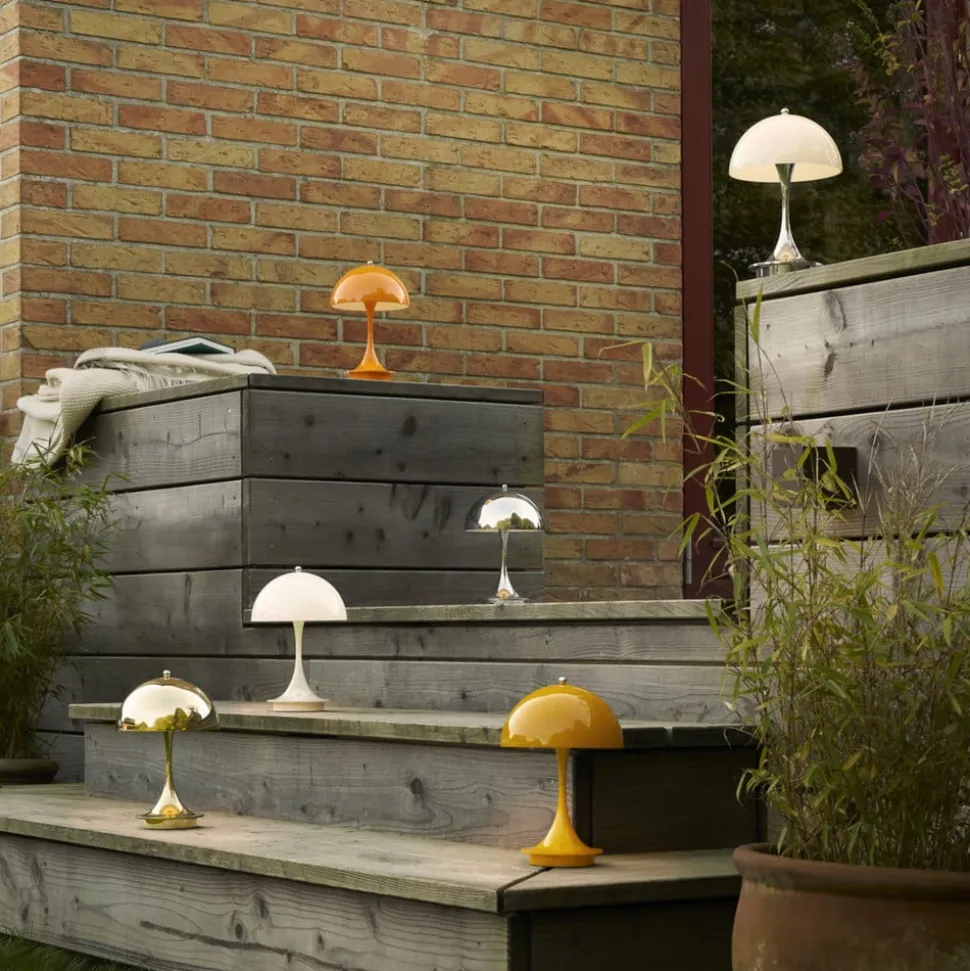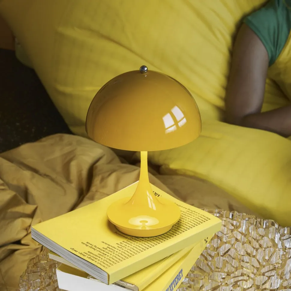 Den batteridrevne LED-bordlampe Panthella Portable 160 i 3. version er fremstillet af sprøjtestøbt, genanvendt polymer. Den er udstyret med en touch-kontakt på den øverste møtrik, hvorved den kan tændes og slukkes og indstilles i tre lysstyrkeniveauer. Designet af Panthella-lampen er et af Verner Pantons mest betydningsfulde designs og afspejler den danske arkitekts store personlighed. Han ønskede at designe en organisk formet lampe, der leverer 100 % blændfrit lys, hvor stativet og skærmen fungerer som lysreflektorer. Panton udviklede Panthella-lampen i 1971 i samarbejde med Louis Poulsen. Lampens karakteristiske form og dens evne til at reflektere et blødt lys fra sin trompetformede fod har givet den status som en designikon. Panthella 160 Portable-lampen er en mindre version af det oprindelige design. Den er perfekt til at tage med fra rum til rum eller ud på altanen eller i haven. Den ser fantastisk ud overalt og skaber en vidunderlig atmosfære.