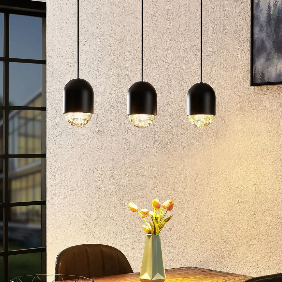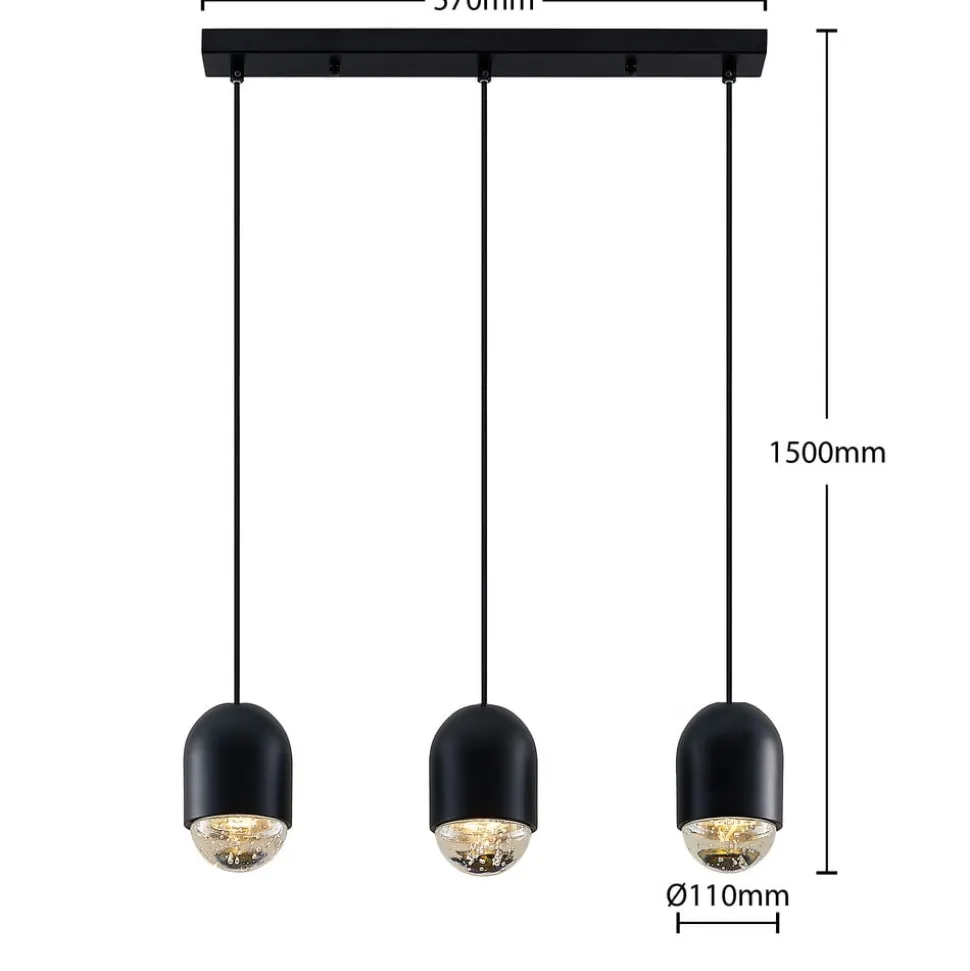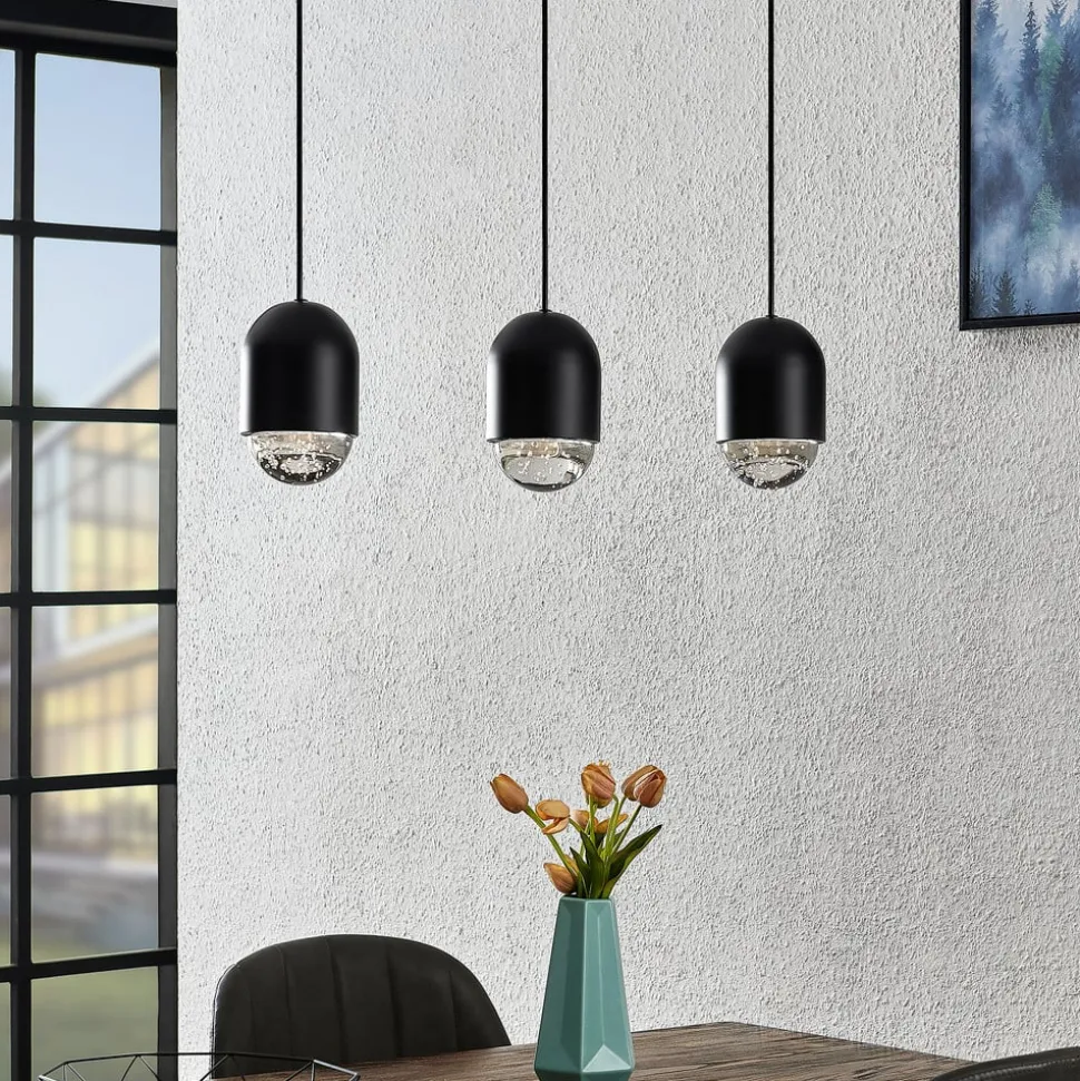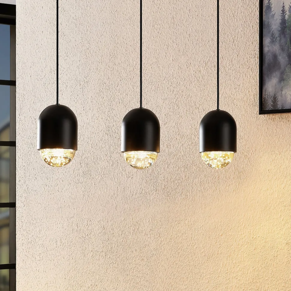 Amielle er en pendellampe med et særligt moderne look . De tre nuancer har næsten elliptisk form og er lavet af sort metal i den øverste del, mens de i bunden ender med et element lavet af glas med en boble-struktur indeni. Dette skaber ikke kun et godt, meget moderne look med en puristisk effekt, men også en unik lyseffekt, der ledsages af en vis gnist. Den aflange stangform med de tre hængende nuancer i sort gør Amielle til en god lyskilde til spisepladsen, som ikke kun lyser op, men også stilfuldt belyses med denne elegante pendellampe.