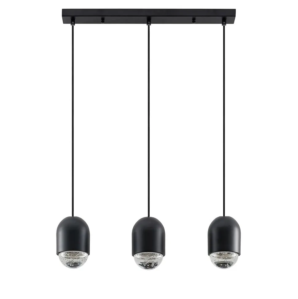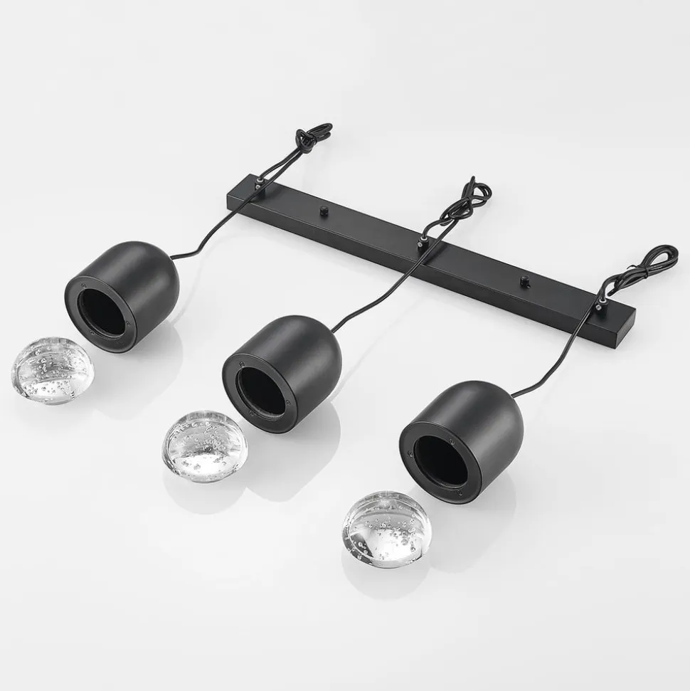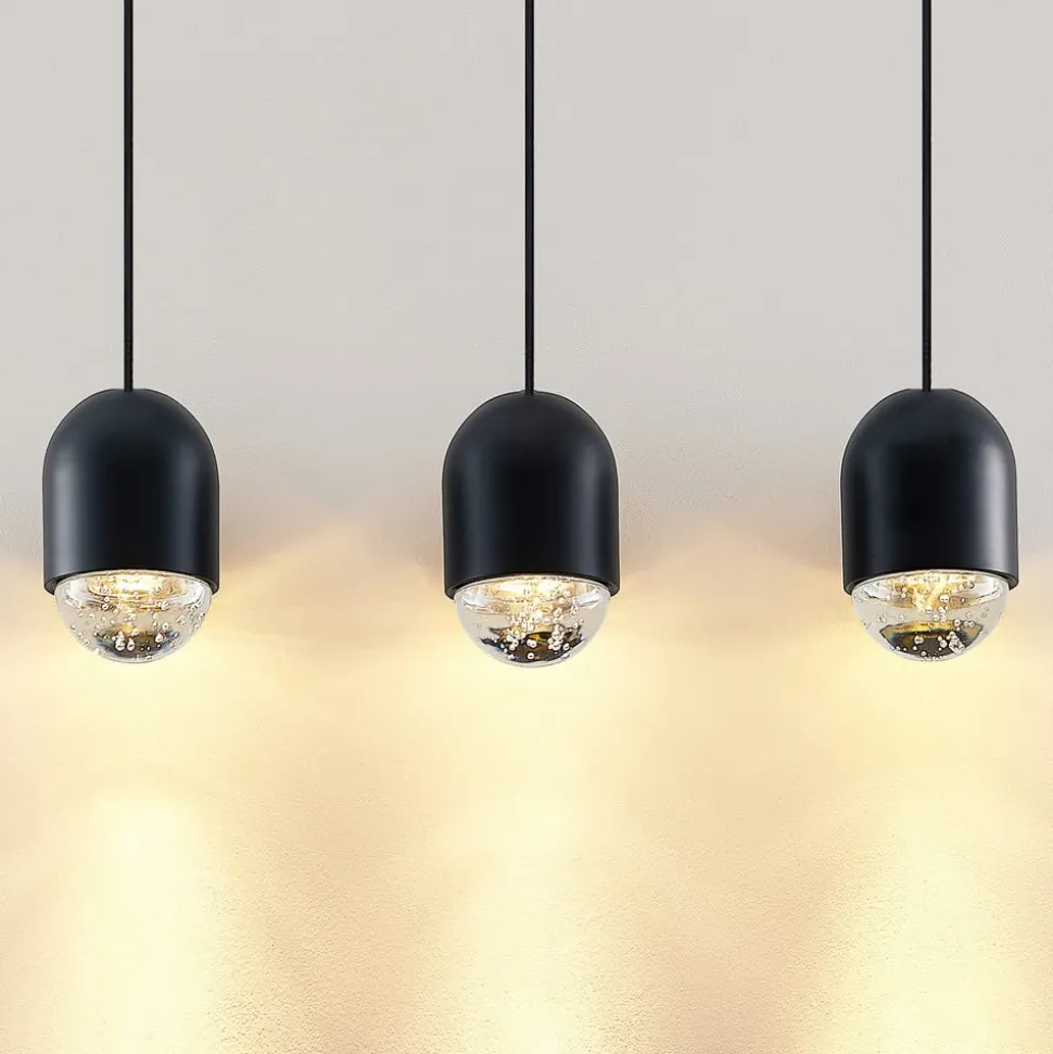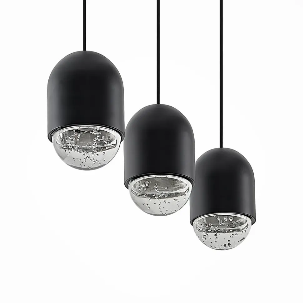 Amielle er en pendellampe med et særligt moderne look . De tre nuancer har næsten elliptisk form og er lavet af sort metal i den øverste del, mens de i bunden ender med et element lavet af glas med en boble-struktur indeni. Dette skaber ikke kun et godt, meget moderne look med en puristisk effekt, men også en unik lyseffekt, der ledsages af en vis gnist. Den aflange stangform med de tre hængende nuancer i sort gør Amielle til en god lyskilde til spisepladsen, som ikke kun lyser op, men også stilfuldt belyses med denne elegante pendellampe.