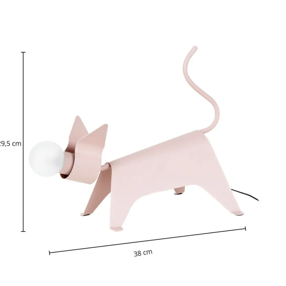 Højkvalitets bordlampe Idalina i form af en kat, pink Idalina imponerer med et smukt og eksklusivt design og et usædvanligt look. Lampekroppens abstrakte form ligner en kat, hvilket gør bordlampen til ikke kun en lyskilde, men også et attraktivt dekorativt objekt til stuen. Den lyserøde nuance skaber en smuk farveeffekt, der er blød, men effektiv og kan kombineres med mange stilfulde interiører. En glaspære supplerer metalkroppen af jern og giver et hyggeligt lys. Perfekt til dyreelskere og designentusiaster, der sætter pris på noget særligt.
