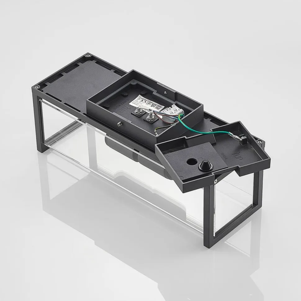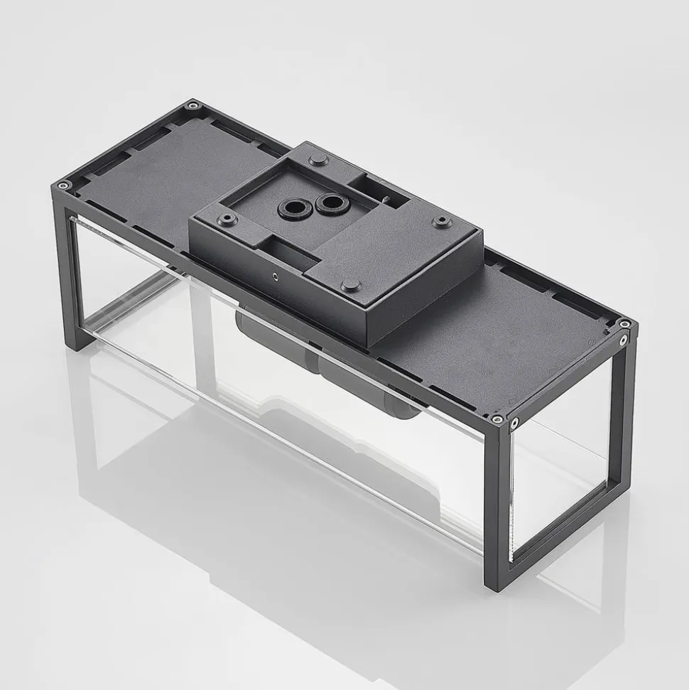 Elwin er særlig lineær og egner sig derfor godt til moderne boligstile og tilsvarende udendørs miljøer. Armaturhuset består af en mørkegrå støbt aluminiumsramme og flere klare glasindsatser. Desuden sidder der i den bageste del et element af en slags vinyl, som har et dekorativt og meget autentisk trælook og dermed ikke kun forfiner det overordnede design, men også giver det et naturligt præg. De to lamper, der skal anvendes, er meget synlige og bør derfor også være koordineret med det overordnede look. De smukke glødelamper eller rustikke lamper, som er modelleret efter klassiske glødelamper, men som er baseret på effektiv LED-teknologi, kan derfor varmt anbefales.