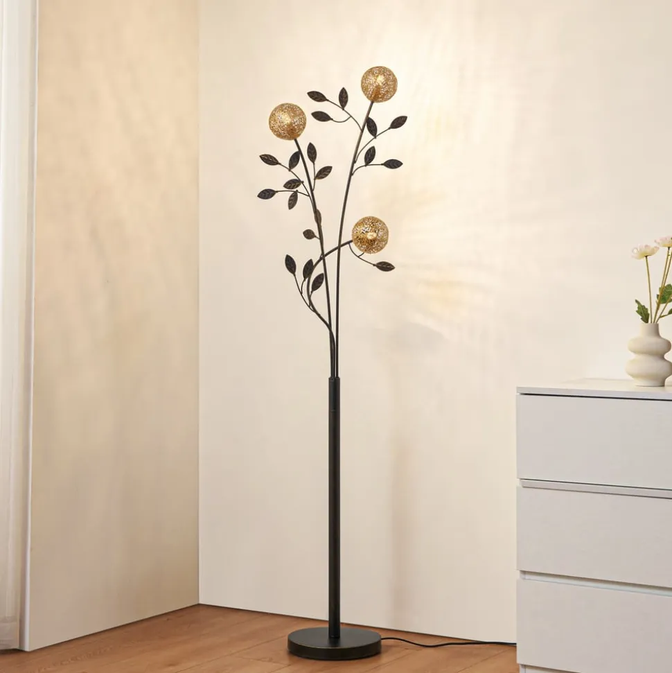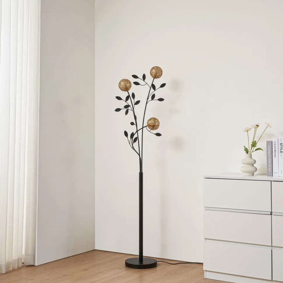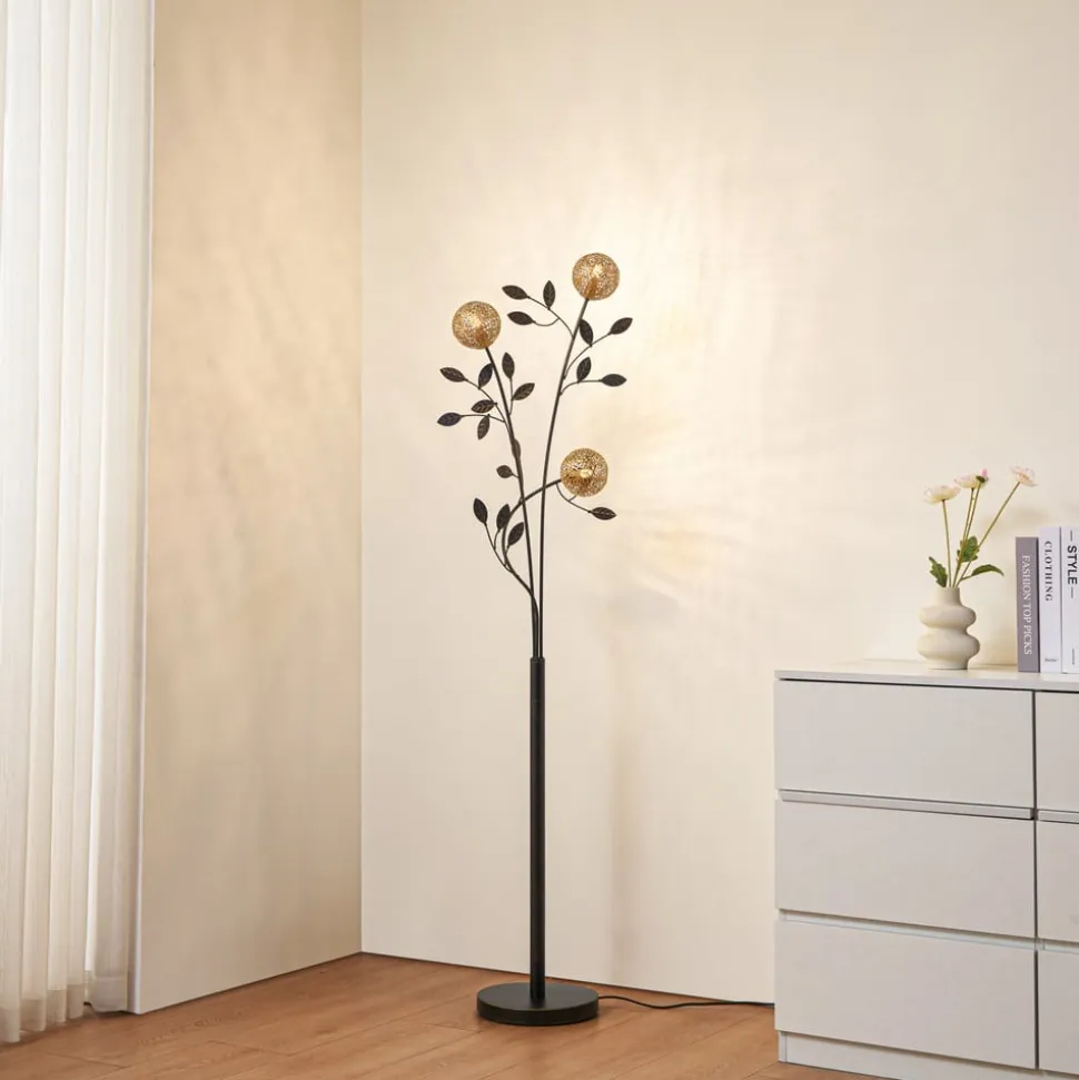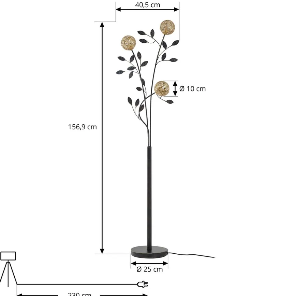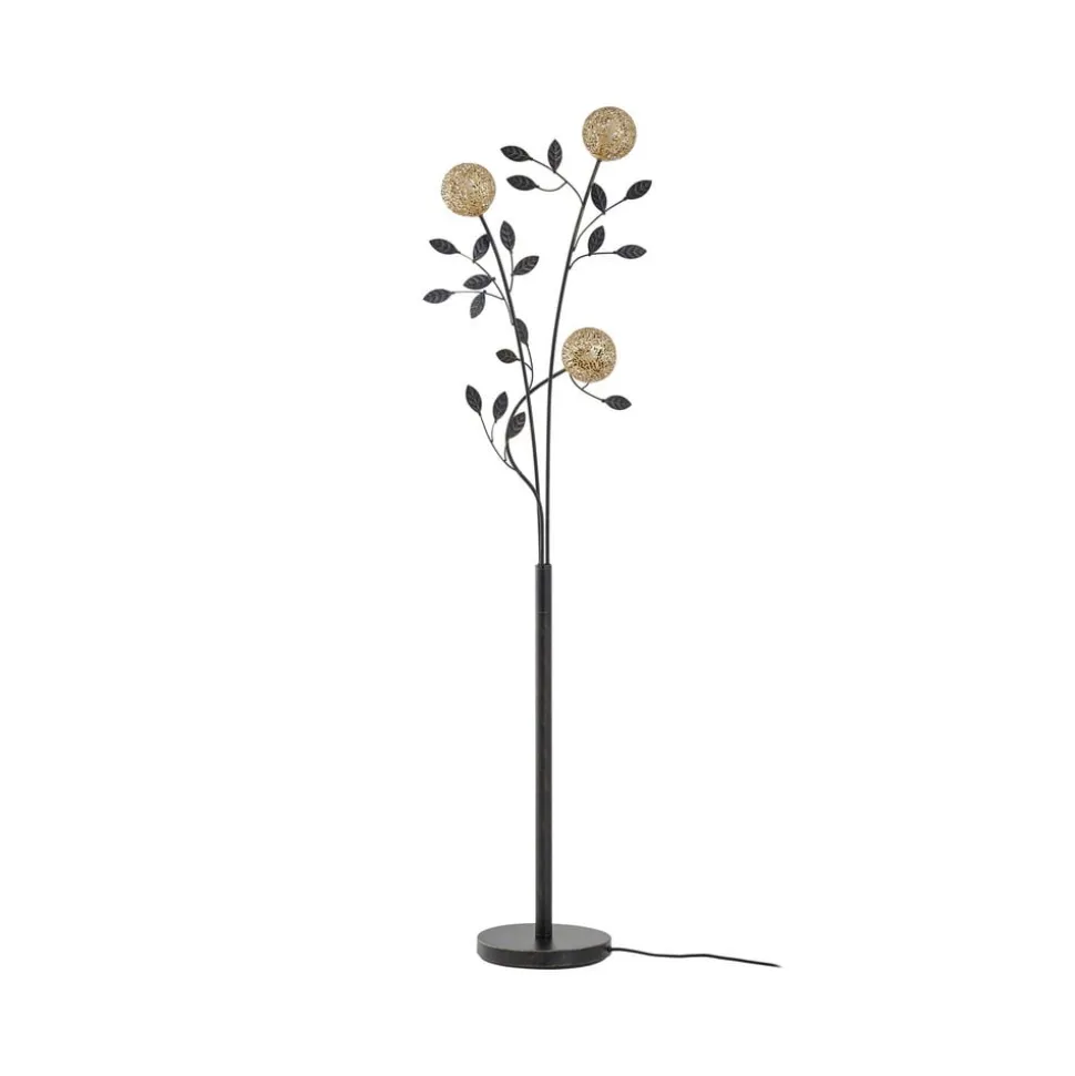 Evory gulvlampe imponerer med sit blomstrede look Evory er en 3 lyskilder gulvlampe lavet af metal. Den består af en robust base med tre metalstænger. Disse stænger er dekoreret med fine blade og ender hver i en kugleformet lampeskærm med filigranmønstre. Det giver ikke kun et smukt helhedsindtryk, men også et godt lysindfald. Det gør Evory til den perfekte tilføjelse til en stue.