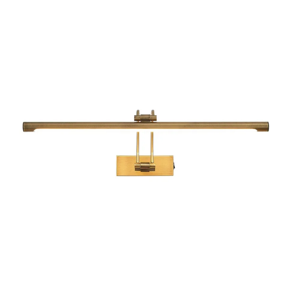 Dimitrij buet LED-gallerilampe Den buede arm og den lange, smalle skærm samt den antikke messingfarve giver Dimitrij-gallerilampen et meget elegant udseende. Lampen er udstyret med LED’er, som bader det billede, der skal belyses, i et varmhvidt lys, så farverne kommer bedst muligt til deres ret. Skærmen og vægbeslaget har også led, der kan bruges til at justere lysstrålens retning på ingen tid.