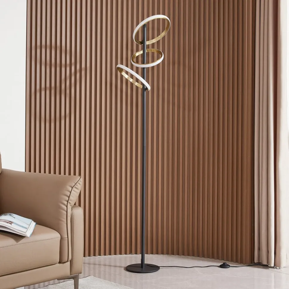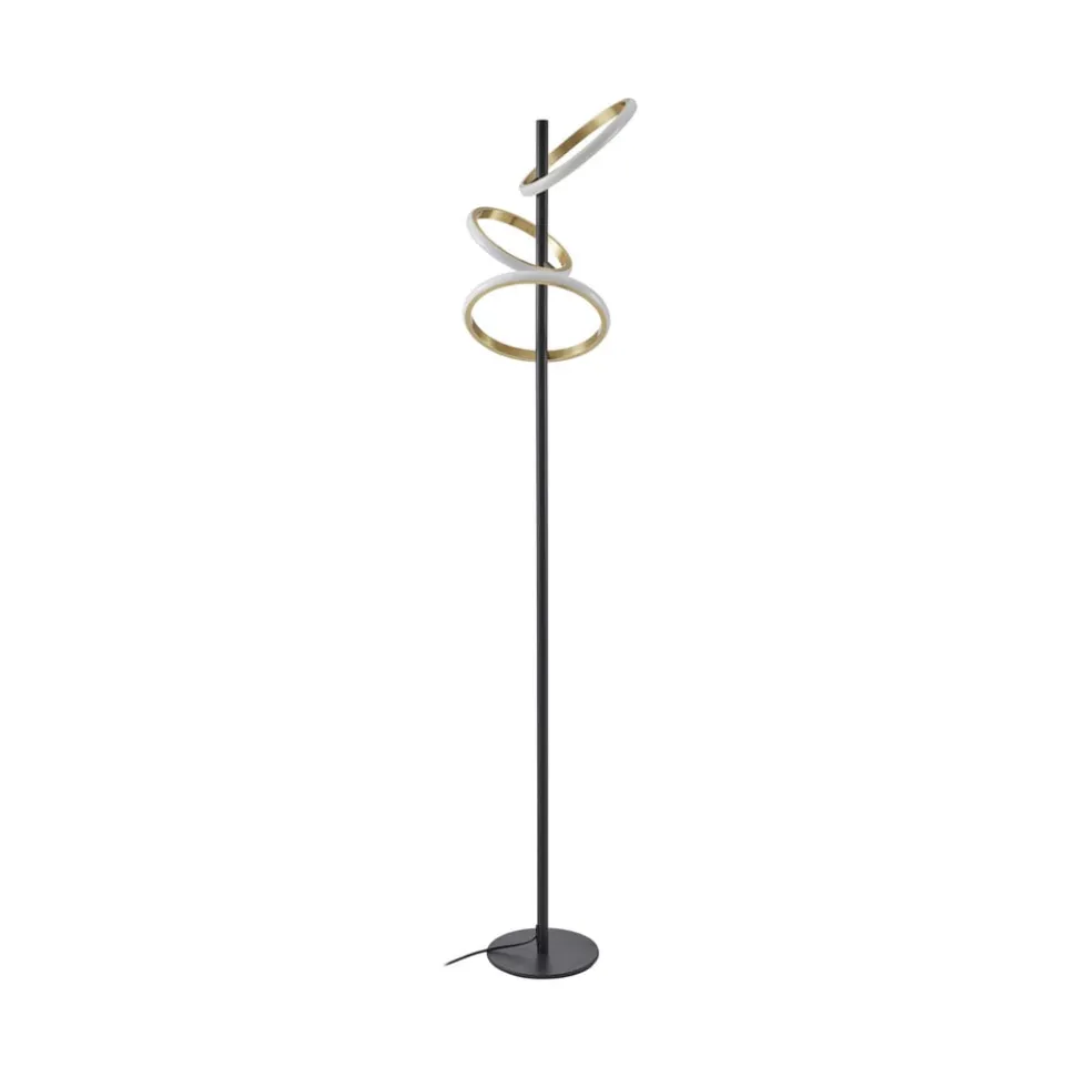 Dæmpbar Madu LED-gulvlampe med universelt hvidt lys Madu LED-gulvlampen med ringformede lyselementer er en moderne og energibesparende belysningsløsning til hjemmet. Med sin integrerede LED-lyskilde giver den et behageligt og klart lys, der fordeles hele vejen rundt, da modulet er fordelt over ringenes ydre spor som en lysstribe. Den medfølgende lysdæmper gør det muligt at justere lysstyrken individuelt og dermed skabe en hyggelig atmosfære. Gulvlampens ringformede elementer giver den også et særligt udseende og gør den til et ægte blikfang.