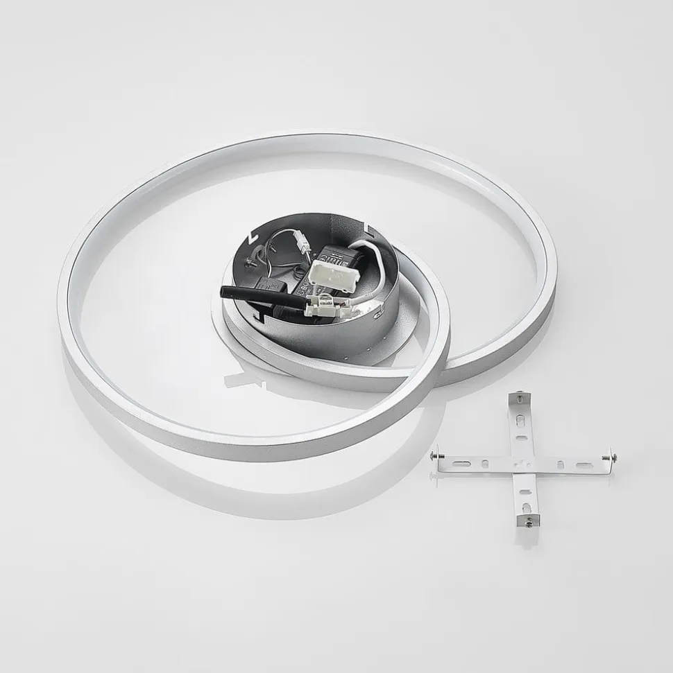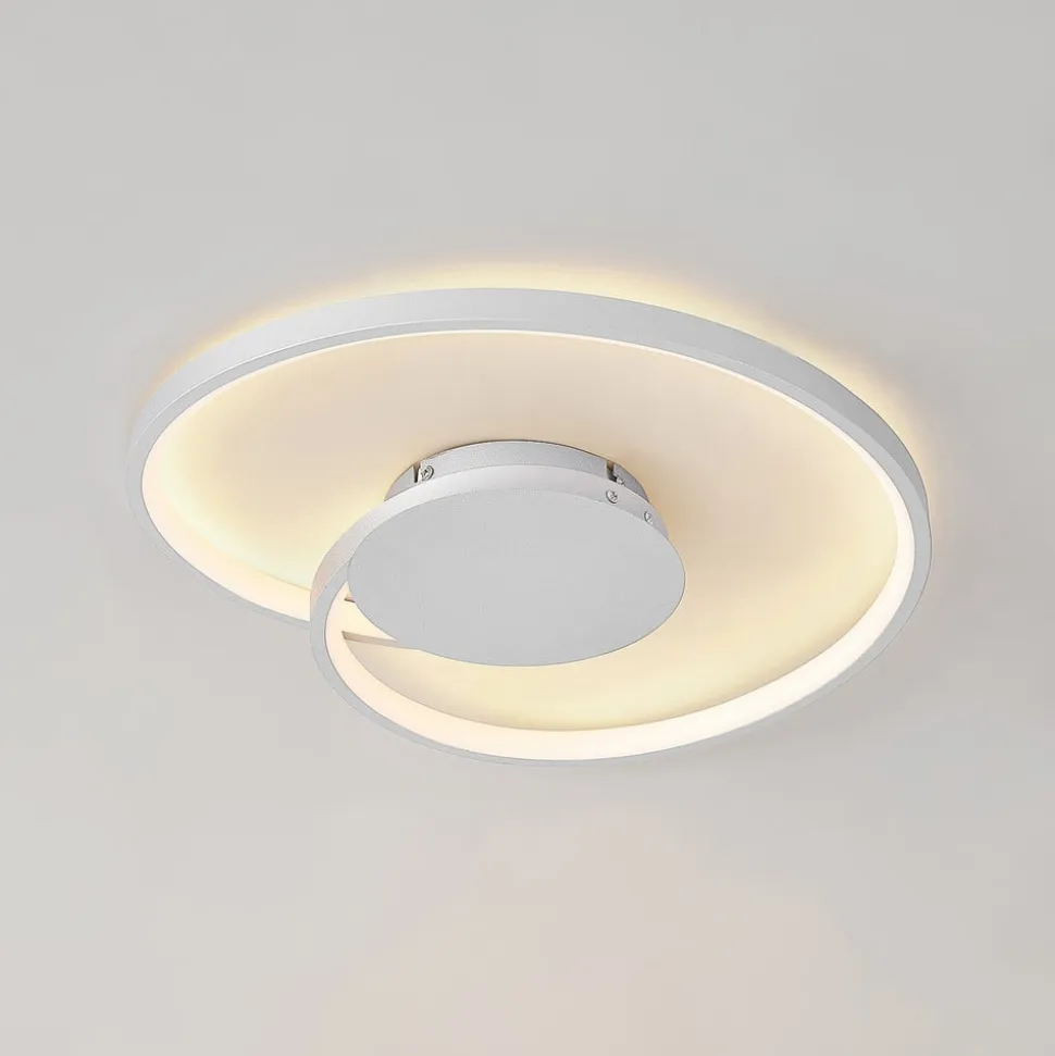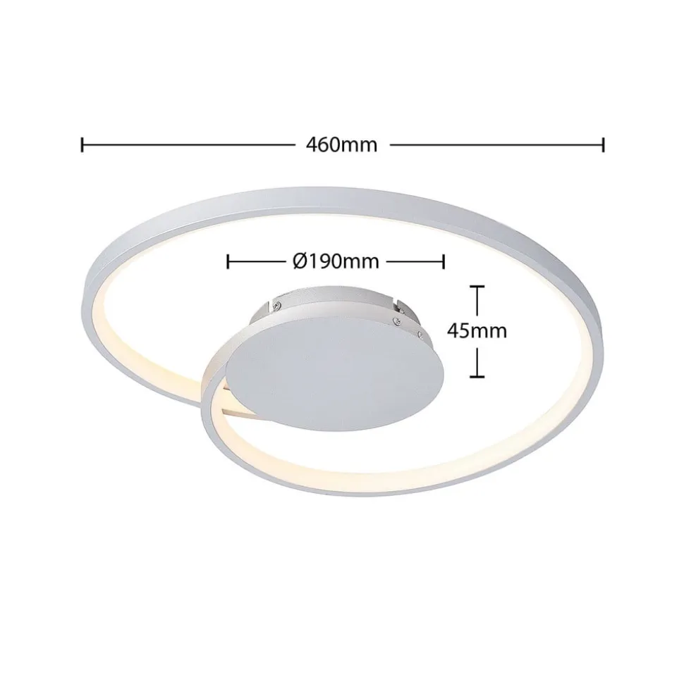 Enesa rund LED-loftlampe af aluminium og jern i sølv LED-loftlampen Enesa har en stilfuld og praktisk karakter. En smal stiver rejser sig svungent fra et rundt loftbeslag og bevæger sig en gang i en cirkel for at skabe et attraktivt mønster. Faste LED’er løber langs disse stivere, og deres lysstyrke kan dæmpes ved hjælp af vægkontakten. Ved hjælp af 4-trins dæmpningsteknologien og den almindelige slukfunktion kan armaturet dæmmes til 100 %, 60 %, 30 % og 13 % af sin normale lysstyrke og tændes og slukkes som normalt. Dette gøres ved at trykke på vægkontakten flere gange. Det moderne design af Enesa LED-loftlampen sætter stilfulde accenter på flade lofter og ser især godt ud i en stue eller et soveværelse.