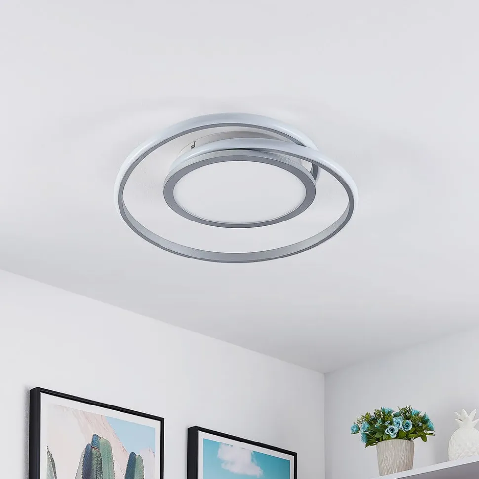Buet LED-loftlampe Noud af jern og aluminium i sølv LED-loftlampen Noud har et attraktivt og elegant udseende. Et rundt element sidder på loftbeslaget, som er omgivet af en buet stiver, der skaber et interessant mønster. Inde i cirklen er der permanent installerede LED’er, som nemt kan dæmpes ved hjælp af en vægkontakt. Ved hjælp af 4-trins dæmpningsteknologien og den almindelige slukningsfunktion kan armaturet dæmmes til 100 %, 60 %, 30 % og 13 % af sin sædvanlige lysstyrke og tændes og slukkes som normalt. Dette gøres ved at trykke på vægkontakten flere gange. LED-loftlampen Noud er især velegnet til installation i stuer eller soveværelser, men ser også godt ud i andre rum. Det moderne ydre kan ubesværet integreres i en lang række indretningsstile uden at være for iøjnefaldende og imponerer derfor med sit behageligt diskrete udseende.