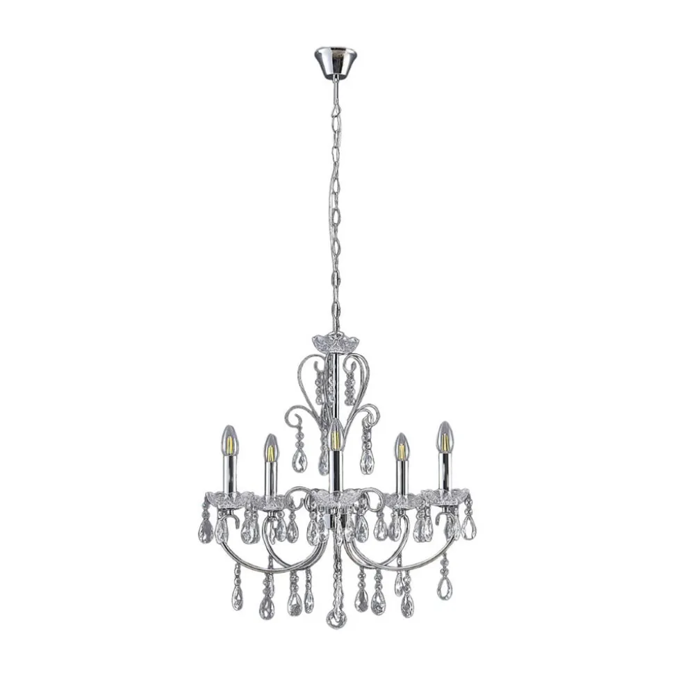 Rigt dekoreret Solveig lysekrone med slebne krystaller og forkromet metalramme Solveig er en fortryllende lysekrone, der drives med 5 E14-lamper og har en rigt dekoreret ramme, der på legende vis integrerer ranker og buede former. Derudover er kromrammen prydet med funklende K9-krystaller, der bringer et udtryk af glamour og luksus til rummet, fordi de funkler så smukt, så snart lyset tændes. Lysekronen er ideel at placere i spisestuen over et bord, og på ingen tid bliver et simpelt måltid i lyset af denne lysekrone til en eksklusiv fest, fordi du føler dig omgivet af en luksuriøs, festlig aura.