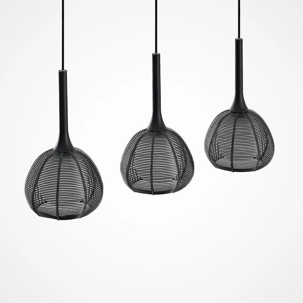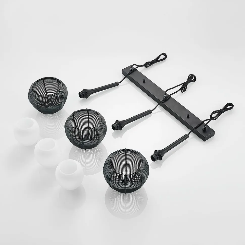 Denne pendellampe i versionen med tre flammer passer godt til moderne faciliteter og giver en hyggelig glød. I alt tre paraplyer hænger fra en bjælke fra loftet og holdes i form af et bur. På ydersiden fremhæver et sort metalnet udseendet, på indersiden er der en anden skygge af glas, der muliggør en hyggelig fordeling af lyset. Kun nedad skinner lyset uhindret, hvilket gør pendellampe i kombination med sin aflange form meget velegnet til bordbelysning i spisepladsen.