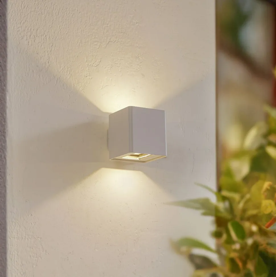 Kantet udendørs LED-væglampe i hvid med et enkelt design Oplev elegancen og funktionaliteten i den udendørs LED-væglampe Aaron, som imponerer med sit moderne udseende og sin finish i høj kvalitet i hvid aluminium. Denne lampe er ikke kun et visuelt HighLight til enhver terrasse eller altan, men giver også pålidelig beskyttelse mod vandsprøjt og støv takket være kapslingsgraden IP54. Den integrerede LED-lyskilde giver energibesparende belysning og skaber imponerende accenter på din ydervæg med op/ned-lysstyring. Nyd den atmosfære, der skabes af det målrettede lysspil fra denne udendørs væglampe, og bliv imponeret over Lucande Aarons kvalitet og holdbarhed – Justerbar strålevinkel (30° – 130°)