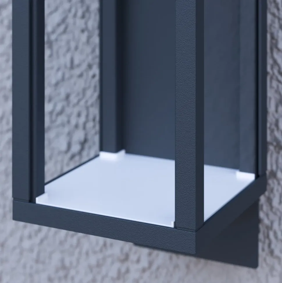 Ferdinand udendørs LED-væglampe med integreret bevægelsessensor og lanterneformet skærm – vinder af Reddot Award 2018 Aluminiumsrammen på denne udendørs LED-væglampe har en mørkegrå finish, og den kantede lampeskærm suppleres af de klare glasruder. Det sikrer, at LED-lyset trænger ind i omgivelserne med sin fulde lysstyrke og bidrager til en klar belysning. Bevægelsessensoren er placeret i den nederste del af lampen, og den reagerer ved en detektionsvinkel på 120 grader og en rækkevidde på 6 til 10 meter. Lanterneformen er fortolket på en meget moderne og ligetil måde, hvilket gør den udendørs LED-væglampe særligt velegnet til moderne arkitektur – hædret med den prestigefyldte Reddot Award – RAL 840-M