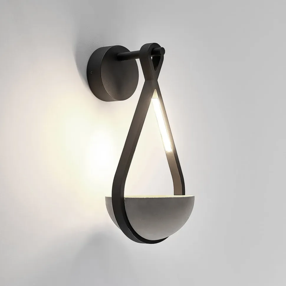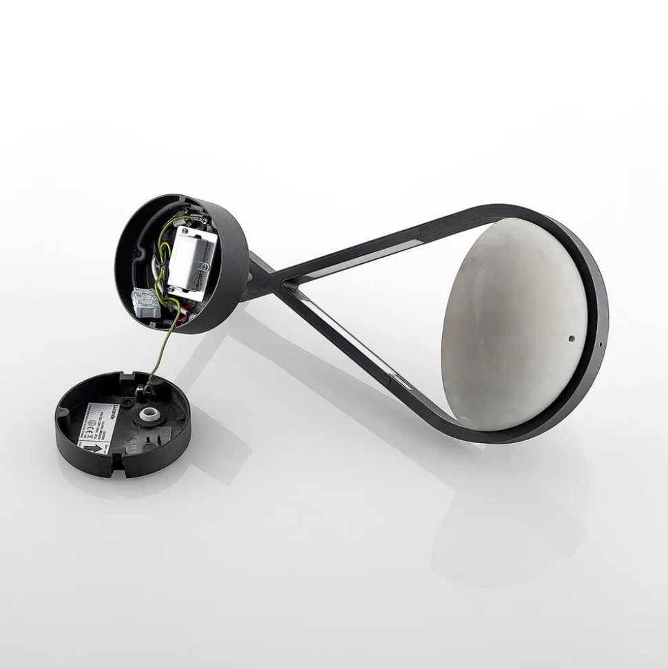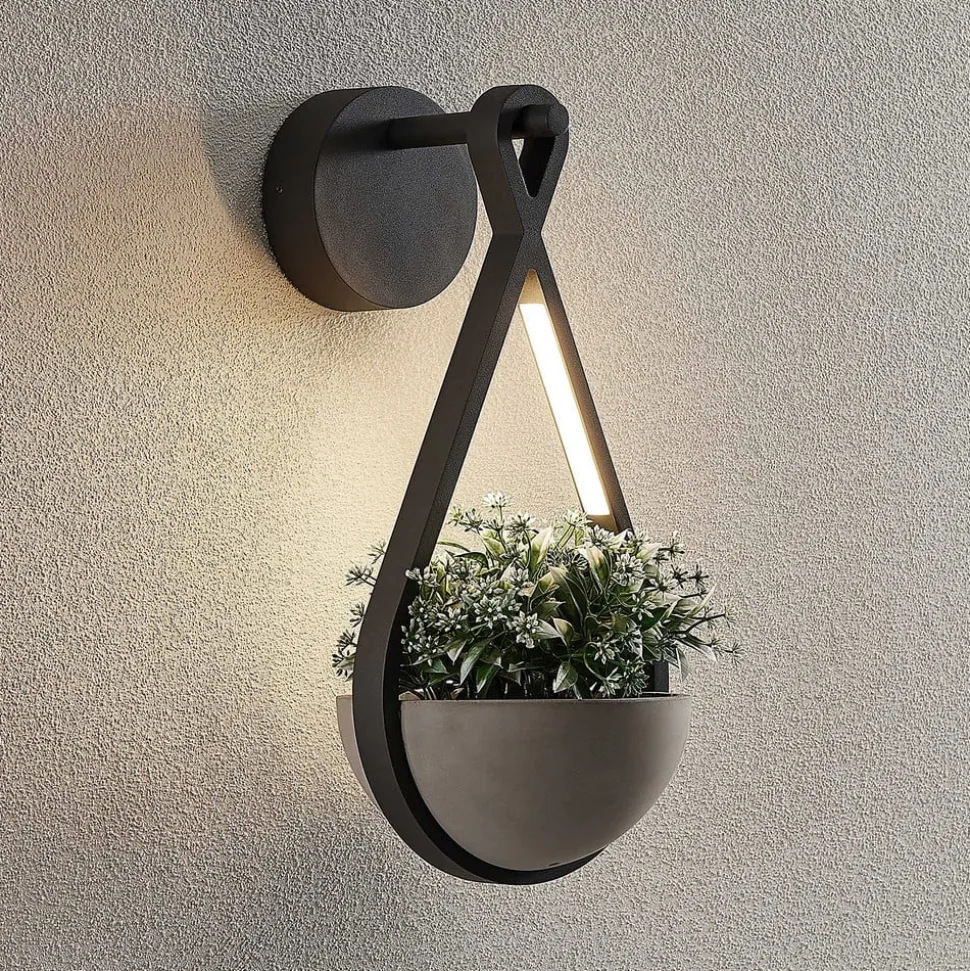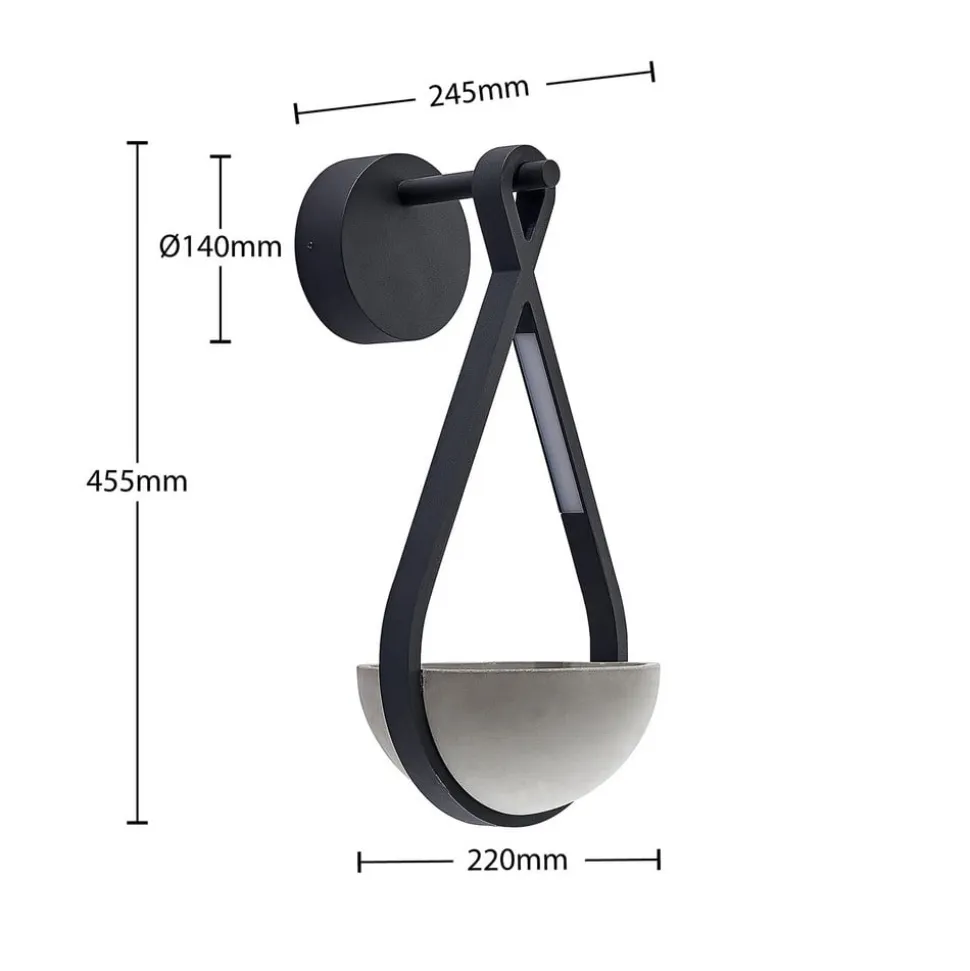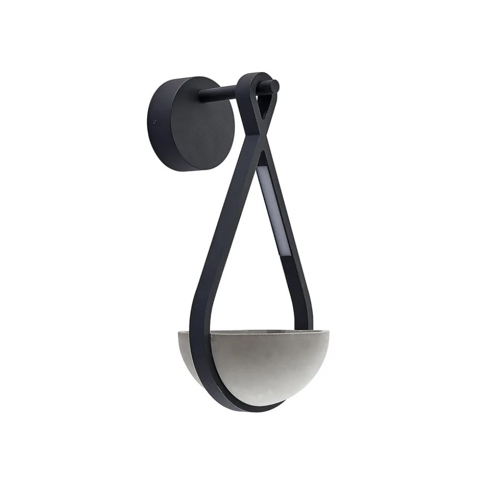 Landlig udendørs LED-væglampe Florka med integreret plantekasse Den udendørs LED-væglampe Florka imponerer over hele linjen med sit kreative design. Den mørkegrå ramme er lavet af holdbart aluminium. Den er kendetegnet ved naturlige, flydende former og indeholder to LED-moduler, der sender et behageligt, varmhvidt lys ned på planteskålen imellem sig. Takket være kapslingsgraden er Florka godt beskyttet mod vind og vejr og er derfor ideel til udendørs brug. Den naturlige patina, der dannes på betonskålen med tiden, er et karakteristisk træk ved beton og natursten. Denne misfarvning er ikke en defekt, men et tegn på naturlig ældning og giver armaturet en særlig æstetik. Hver lampe er derfor unik og passer harmonisk ind i dit have- eller terrassedesign