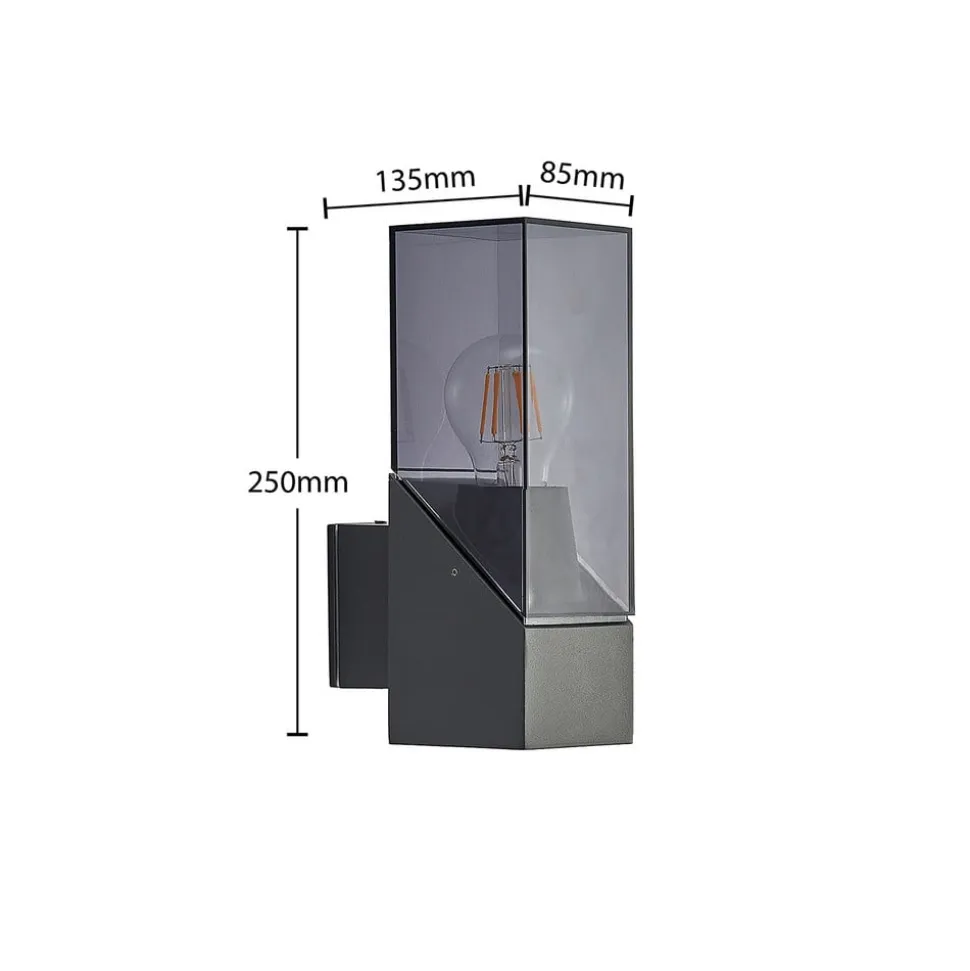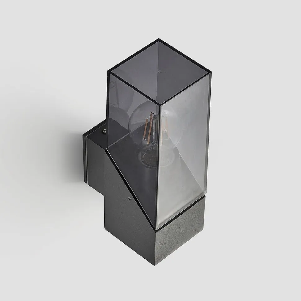 Moderne udendørs væglampe Fiola med et dekorativt look Den moderne væglampe Fiola giver et godt og tilstrækkeligt stærkt lys til udendørs områder. Den kan f.eks. bruges omkring indgangsdøren, kældertrappen eller på altanen eller i haveskuret, dvs. overalt, hvor der er brug for lys i aftentimerne for bedre orientering og sikkerhed. Kroppen på udendørslampen Fiola er lavet af mørkegråt aluminium, som er smart kombineret med en gennemsigtig, let røggrå skærm af plast. Pæren, som her er vist åben, er ideelt set en dekorativ filamentpære eller retrofitpære.