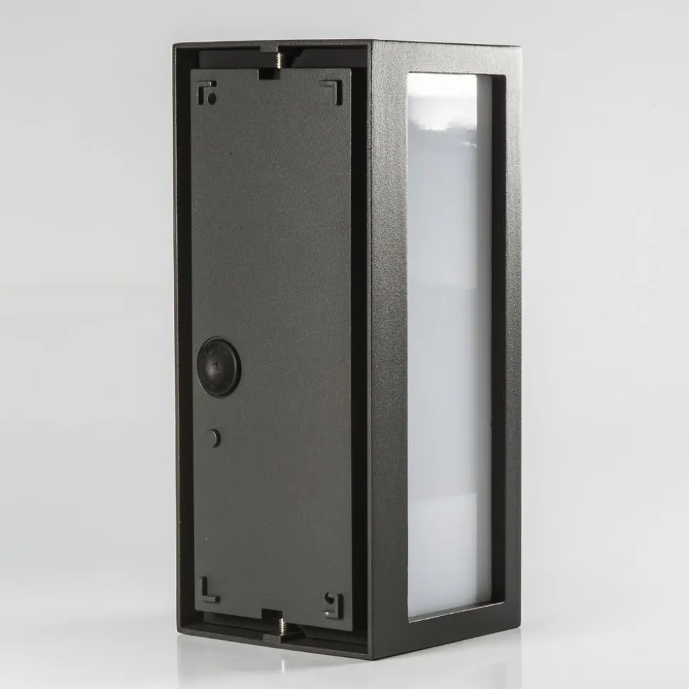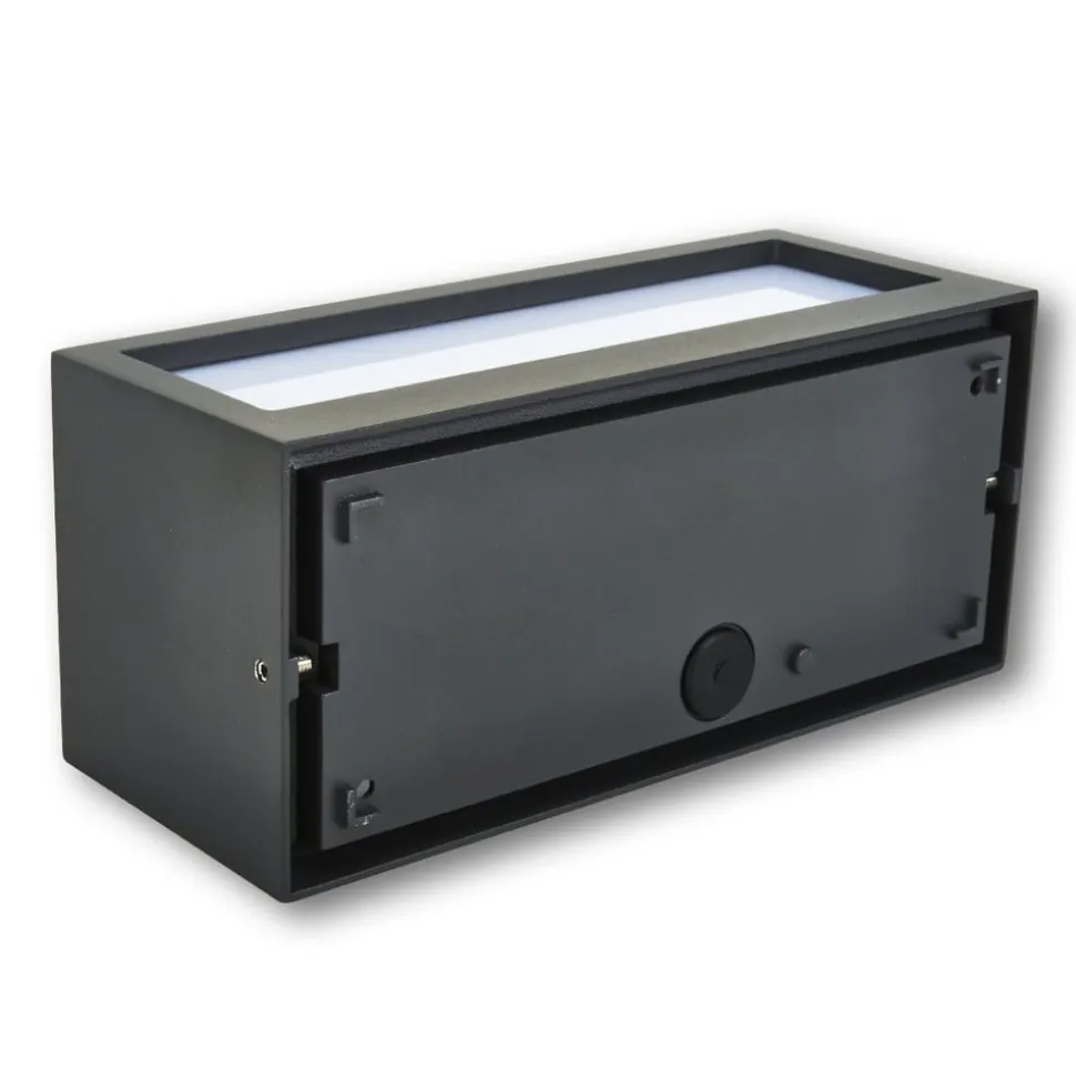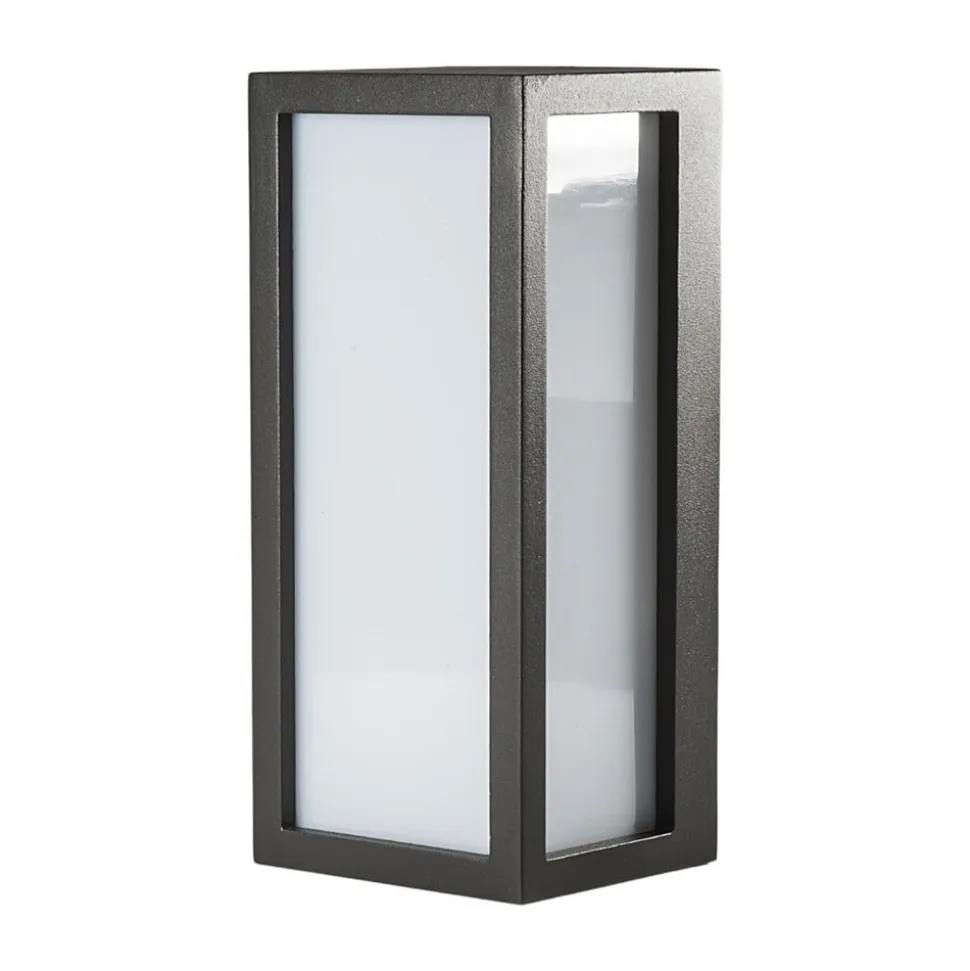 Rektangulær Tame udendørs væglampe med tresidet lysudslip og robuste polykarbonatindsatser Denne udendørs væglampe med kapslingsgrad IP54 giver ikke kun et smukt og jævnt lys takket være de opalhvide indsatser, men har også et diskret stilrent og moderne look med sin grafitgrå ramme, så den kan bruges til at skabe smukke accenter på facaden af et hus eller anden form for murværk. Det er en stor fordel, at indsatserne er lavet af robust polykarbonat, da det er langt mindre skrøbeligt end glas, og udendørs er et armatur udsat for vind og vejr, som ikke har den store effekt på dette materiale. Den udendørs væglampe er udstyret med en E27 sparepære på op til 18 W, så strømforbruget kan holdes lavt.