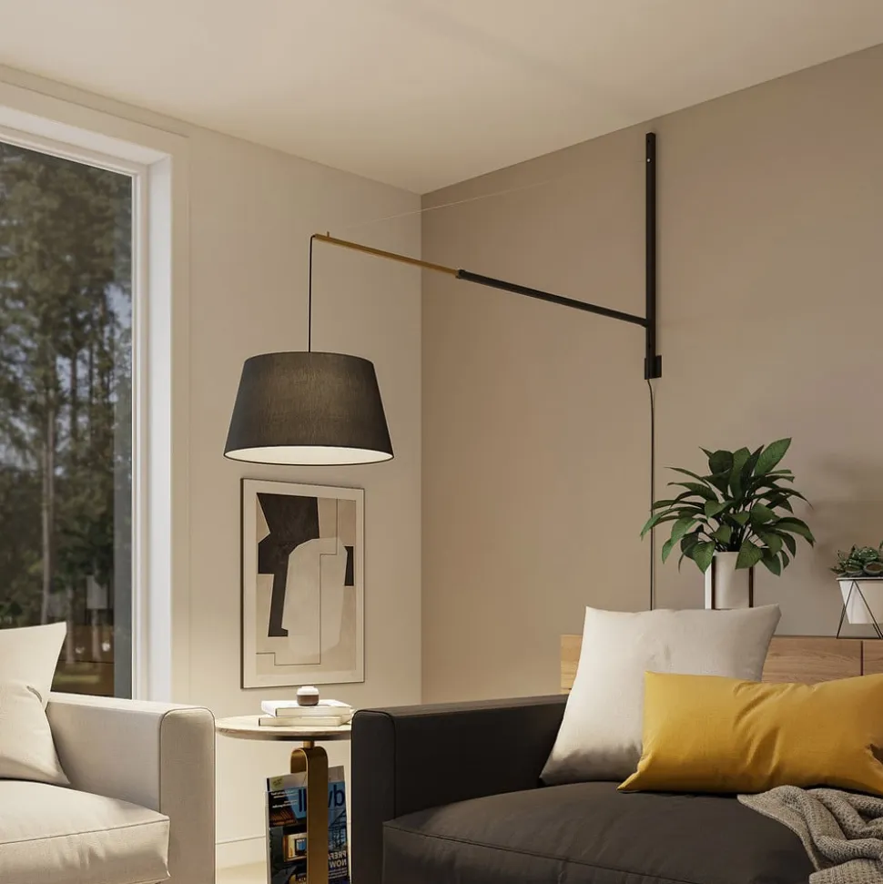 Udtrækkelig Beleza væglampe med sort stofskærm Beleza imponerer med et moderne touch og et usædvanligt design, da den ser ud til at være et tænkeligt alternativ til en hængelampe. Her hænger den sorte skærm dog ikke ned fra loftet, men strækker sig ud i rummet via et vægbeslag, hvis fremspring kan justeres. Beslagets sorte og gyldne farver giver en effektfuld kontrast, og udspringet kan justeres fra 136 cm til 218 cm, hvilket sikrer en vis fleksibilitet. Et seværdigt belysningsarmatur til moderne interiør!