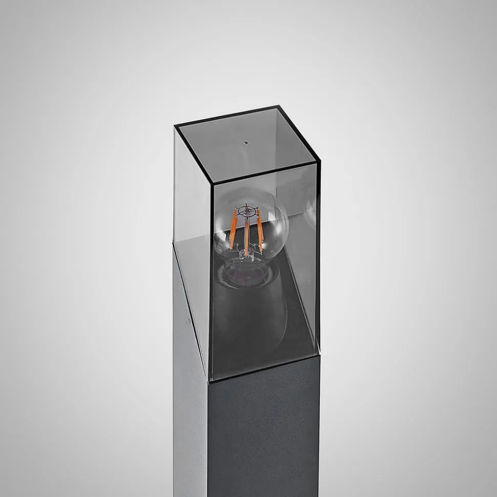 Attraktiv og moderne belysning til udendørsarealer – Fiola vejlampe Den moderne Fiola vejlampe er ideel til at give tilstrækkeligt lys langs havestier, indkørsler eller ved husets indgang i skumringen eller om natten. Det moderne look på dette attraktive armatur gør det ikke kun til en ideel ledsager rundt om huset efter mørkets frembrud, men imponerer også i dagslys. Den rektangulære krop på det mørkegrå aluminiumsarmatur er let skrånende i toppen og suppleres af en lys røggrå plastskærm. Den indvendige pære, som ikke er inkluderet i leveringsomfanget, er åben og synlig. Moderne filamentpærer eller retrofitpærer er derfor ideelle til brug i Fiola vejlampen.