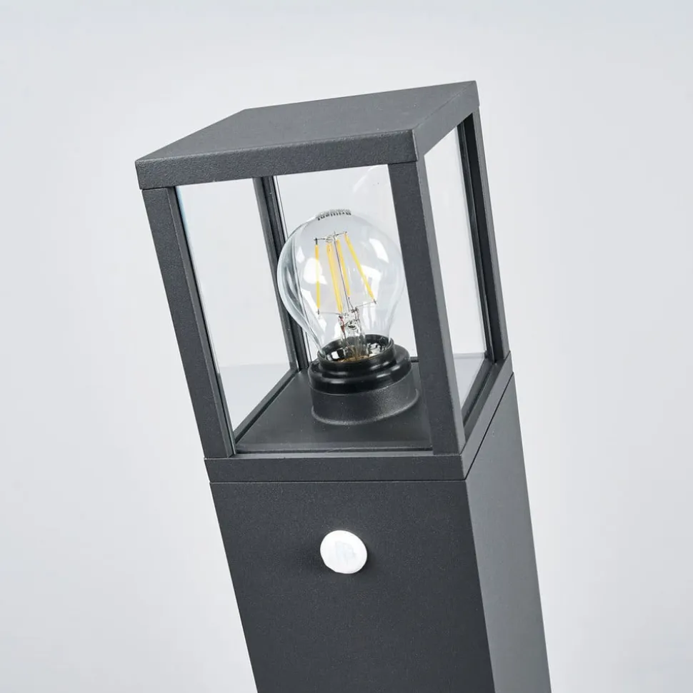 Grafitgrå Klemens vejlampe med nyttig sensor til registrering af bevægelse Klemens har et meget moderne udseende med sin kantede form og er derfor ideel til installation i omgivelserne i moderne bygninger. Klare glasindsatser på alle sider af den øverste sektion giver et direkte udsyn til pæren og forringer dermed ikke lysstyrken. Det faktum, at vejlampen har en integreret sensor, viser sig at være meget praktisk, for så snart en person nærmer sig lyset, reagerer den ved at tænde, så man straks har lys nok til at orientere sig. Sensordata: – Registreringsvinkel 180° – Rækkevidde 8 m – Lysvarighed justerbar: 5s – 30 s – 1 min – 3 min – 5 min – 8 min