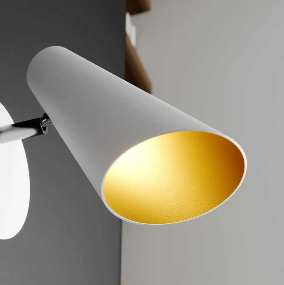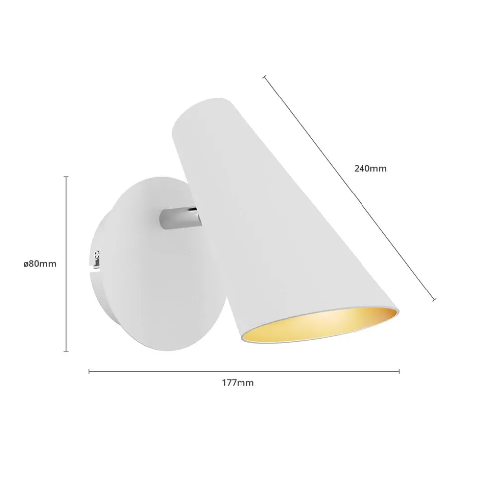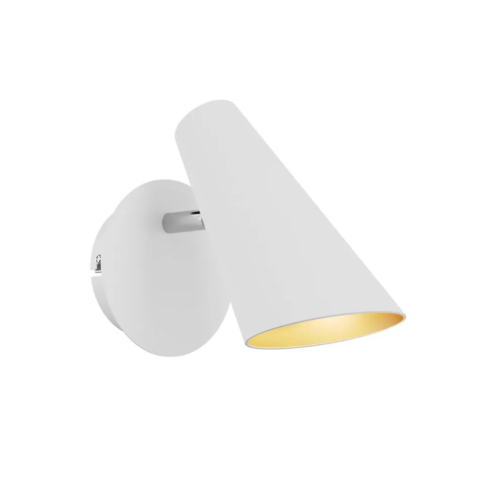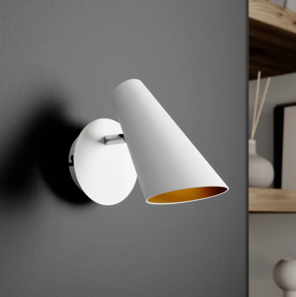 Den moderne væglampe Wibke er rent optisk inspireret af den skandinaviske stil. Lampeskærmen er konisk og guldlakeret på indersiden. Når lyset tændes, skaber væglampen, som ellers er holdt i en ren hvid, en behagelig og hyggelig atmosfære. En praktisk knap, der er monteret direkte oven på skærmen, gør det let som en leg at bruge Wibke. Lampeskærmen er desuden bevægelig, så lysets orientering kan tilpasses individuelt. Dette gør Wibke til et moderne, ekstra lys til læsehjørnet eller den moderne stue.