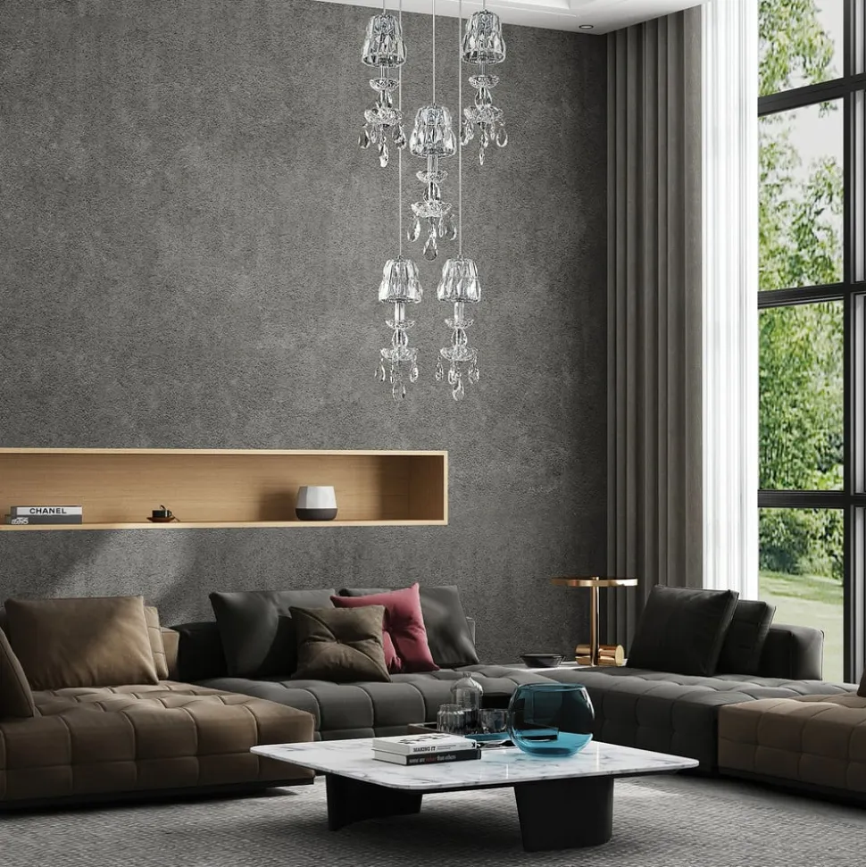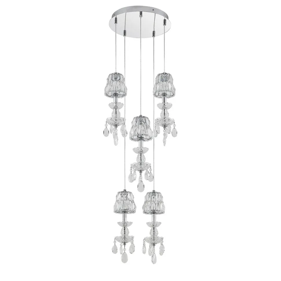 Hos Yasanie bliver krystal-smykket lyskilder knyttet til en rund loftsbeslag og fem af dem hænger ud i rummet i forskellige højder. Uden tvivl skaber dette et meget specielt look med hængelampen, som fremstår meget individuel og værd at se og også spreder et strejf af luksus og glamour i rummet. Armaturet er meget velegnet til brug i opholds- og spisepladsen, og hele udseendet drager fordel af de mange skårne krystalelementer og de pænt dekorerede glasskåle, men også lyseffekten, der er kendetegnet ved en elegant gnist og glitter, så snart du gå lampen tændes og de frit valgbare lamper skinner i deres fineste lys. Et højdepunkt til belysning af boligarealer, der giver moderne værelser et glamourøst, sofistikeret look.