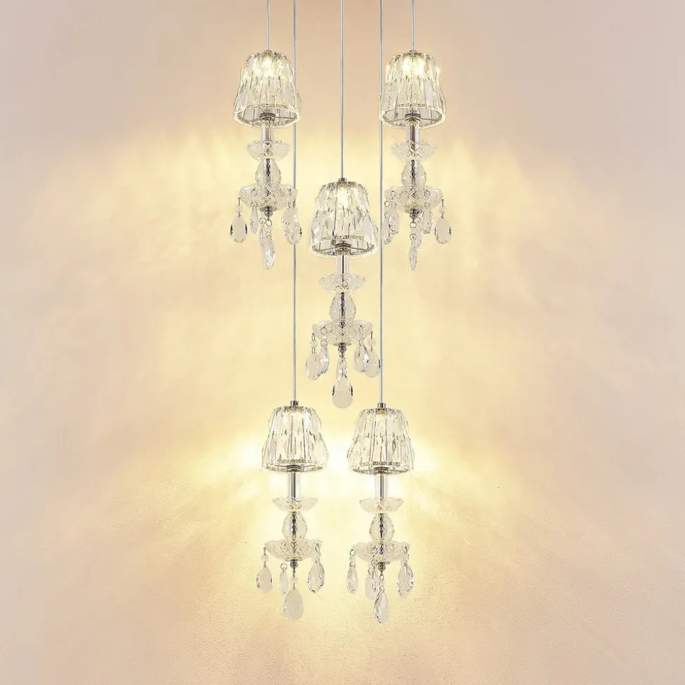 Stor flair i stuen med smukke krystaller: Yasanie-pendellampen med fem pærer