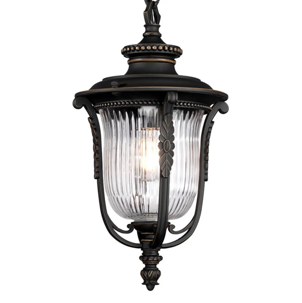 Luverne pendellampe er udstyret med en rustik kædefjedring og er ideel til det lyse design af overdækkede udendørs arealer. De inkorporerede mønstre er fremhævet med en olie-gnides finish. Skærmen er udstyret med klart, rillet glas, gennem hvilket lyset fra det anvendte lysstof skinner i alle retninger.