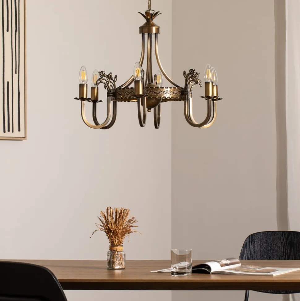 Lysekrone Castle lys patineret med 6 lyskilder forener antik charme med moderne funktionalitet. Fremstillet af højkvalitets metal og med en elegant lys patineret messingfinish passer denne lysekrone perfekt ind i stuen og spisestuen. De seks pærer sikrer en jævn og imponerende lysfordeling, der bader ethvert rum i en stilfuld atmosfære.